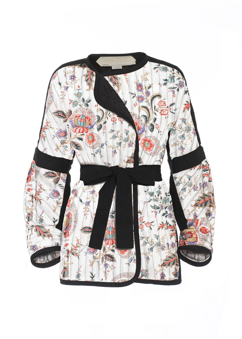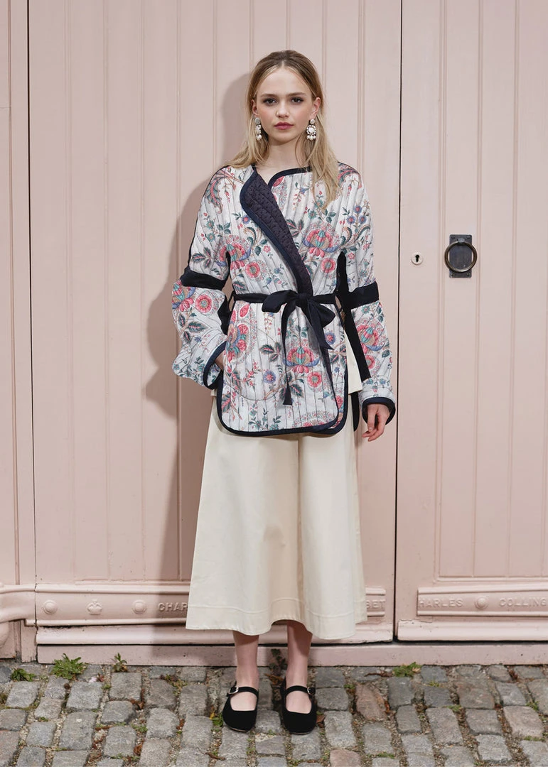Claire Jacket in French Cascarin Cotton print with Lavender Cotton Lace.