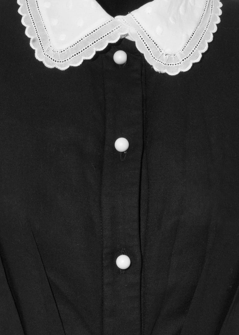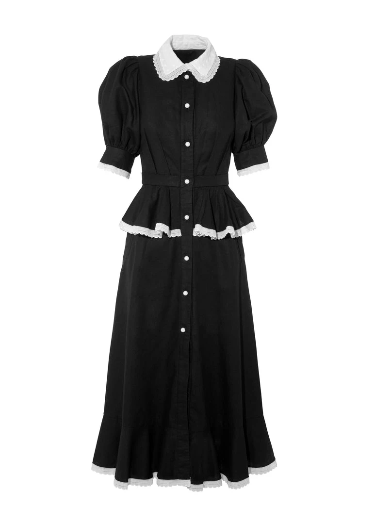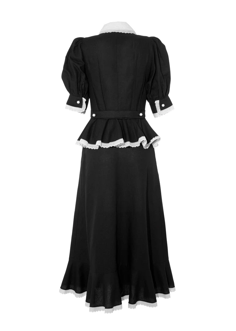 Anita Peplum Midi Dress with a white broidery cotton lace and white swiss dot cotton collar made from black linen or in natural linen (natural colour way not available until May)