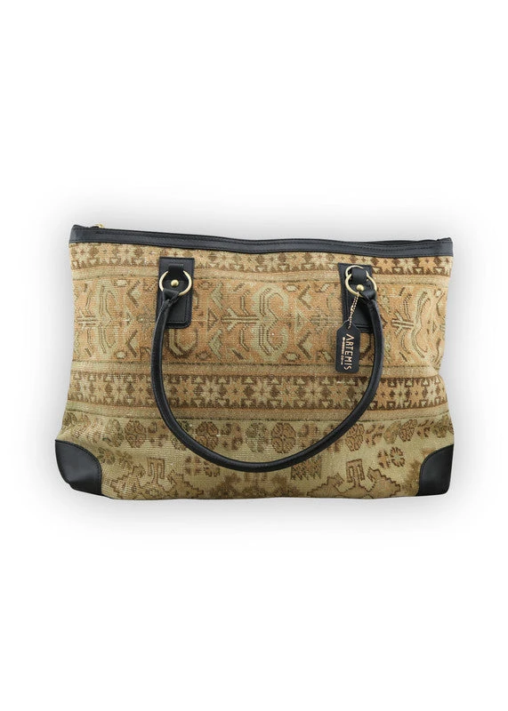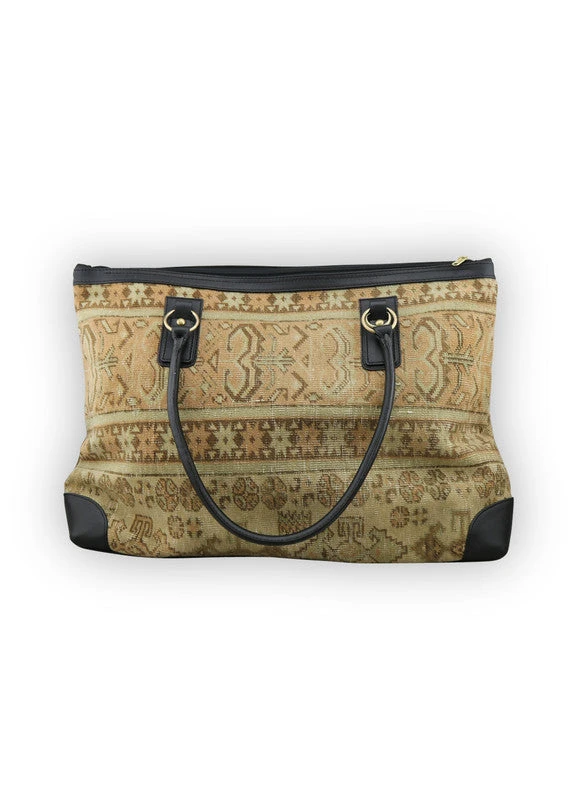 - Made from vintage hand-knotted Anatolian Oriental Carpet–typically wool, or a wool & silk blend. Soft leather trim, lined in cotton canvas.