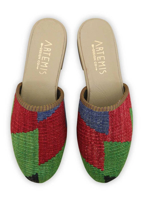 Our Kilim Slides are inspired by a traditional clog silhouette, but feature a sleeker, more feminine profile. This style is very flattering with jeans, skirts, and with short skirts and tights in the cooler seasons. Our Kilim shoes are handmade from vintage, hand-sourced Turkish carpets, which means that no two pairs of our Kilim shoes will ever be alike. The Kilim Slides pictured here are the actual pair that you will receive.