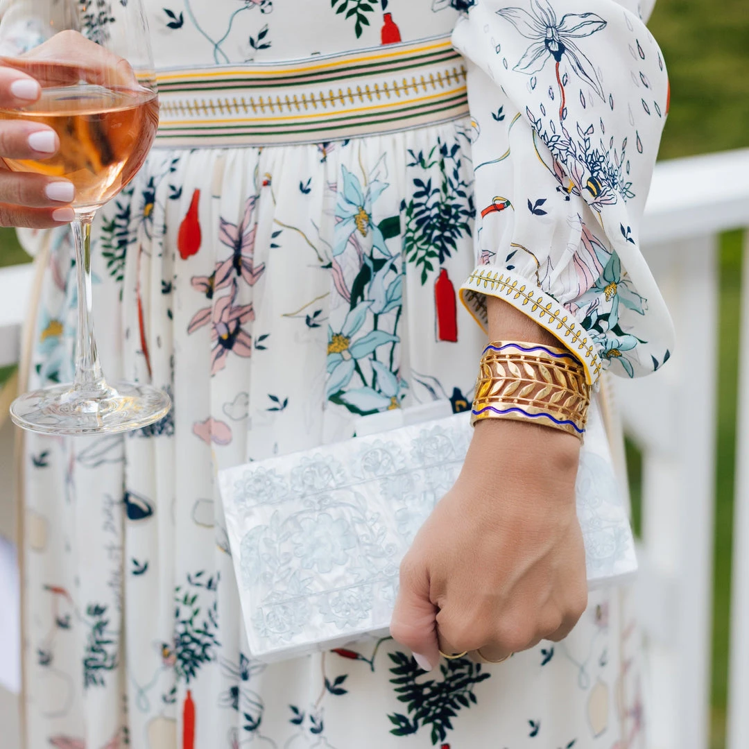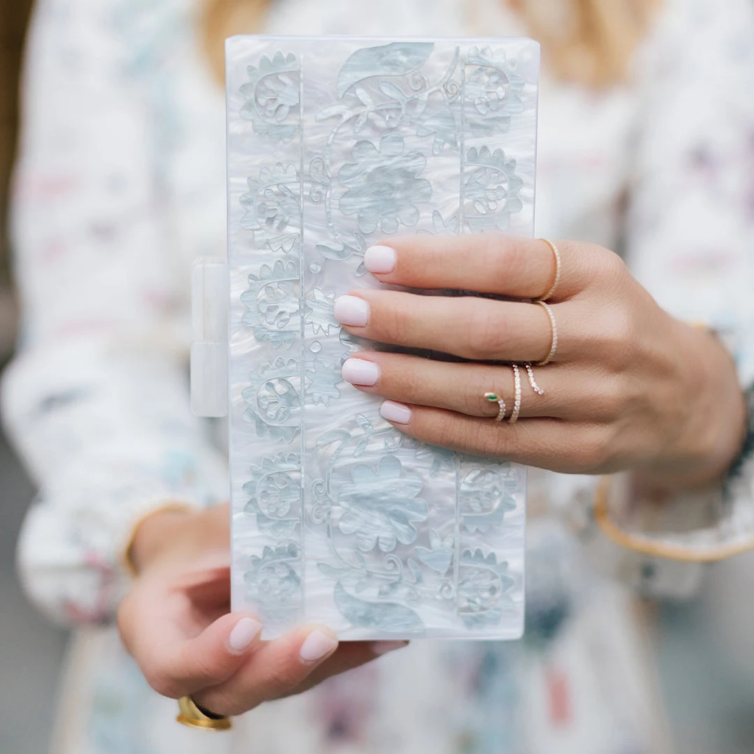 Acrylic clutch embellished with stenciled motif. Mirror and optional chain inside. Pearl and Aquamarine. Fits an iPhone.