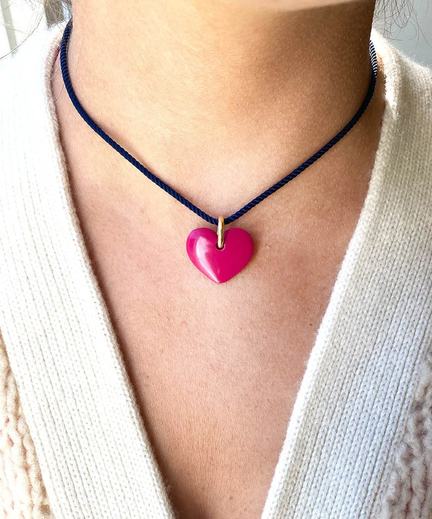 Our signature heart pendant adds a fun pop of color. It has a beautiful 18-karat yellow gold bail, which opens to clip into any chainlink size. It is the perfect sized pendant for a short or long or delicate or substantial necklace chain. Oui, oui, it is a versatile and wonderful piece!If your size is not available, we are able to place a special order. Lead time is approximately 3-4 weeks.