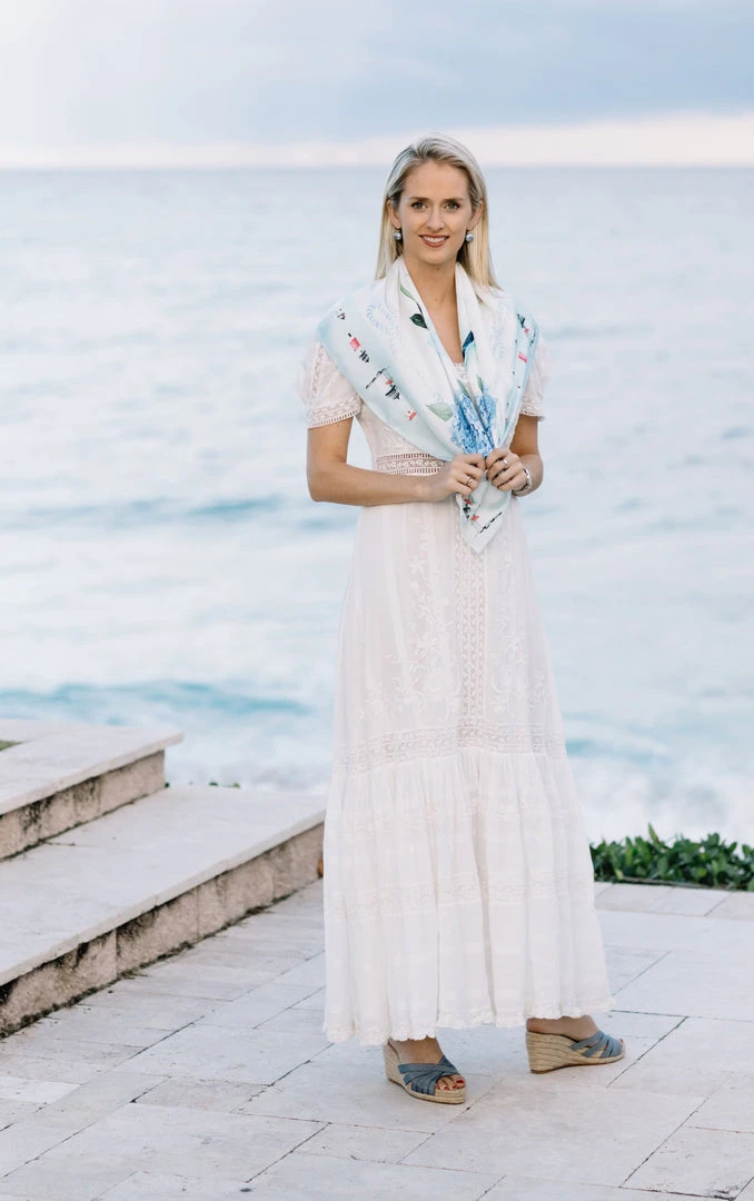 Meredith Hanson is a Nantucket based artist and designer. While trained in numerous fine art mediums, Meredith stumbled upon Gouache a couple of years ago and now it is her signature art form. She moved to Nantucket in the fall of 2011 to open up her design studio where she has collaborated with many of the local businesses on the island and beyond. The nostalgic charm of Nantucket with its luscious seascapes, beautiful hydrangeas and peaceful, simple way of life has given the inspiration for this illustrative scarf. When Meredith is not painting, you can find her strolling, coffee in hand, through Sconset taking in all the island’s beauty with her dog Willis.