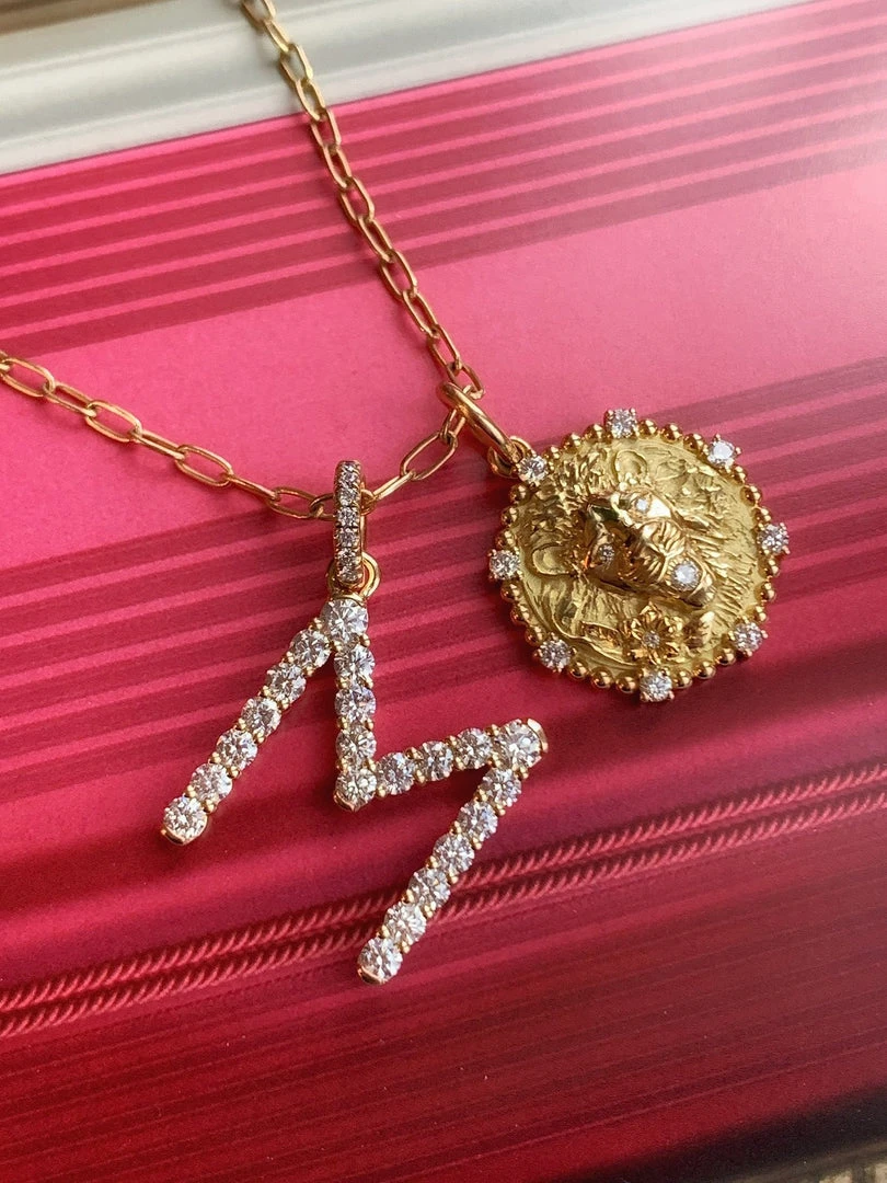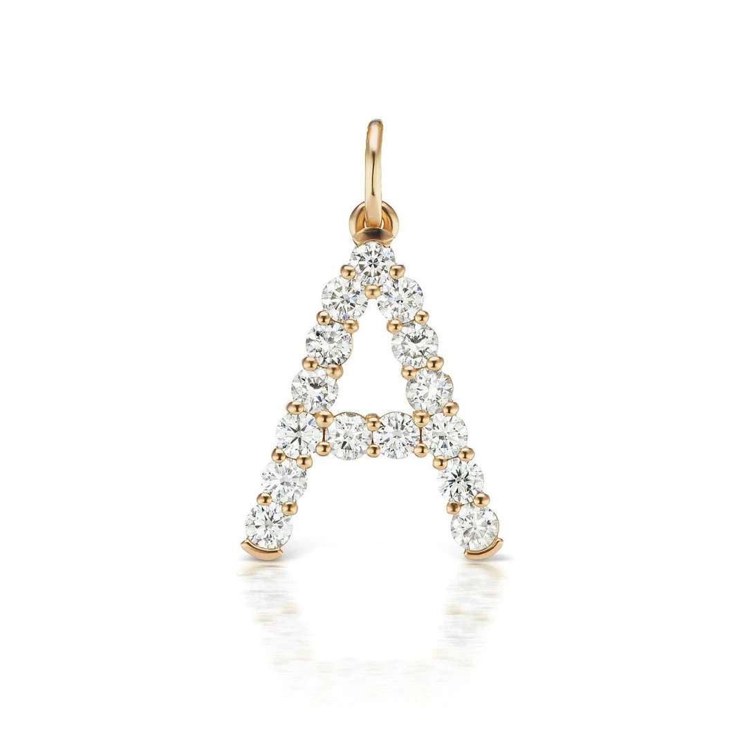 A pendant featuring the initial of your choice comprised of round brilliant diamonds in a delicate 18k gold mounting with round beaded back.