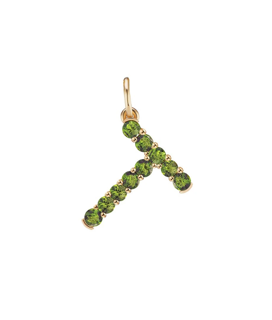 A pendant featuring the initial of your choice comprised of round Peridots in a delicate 18k gold mounting with smooth beaded back.