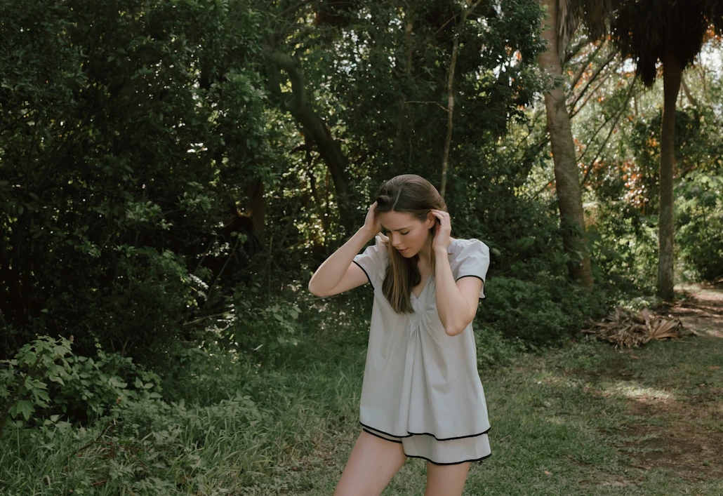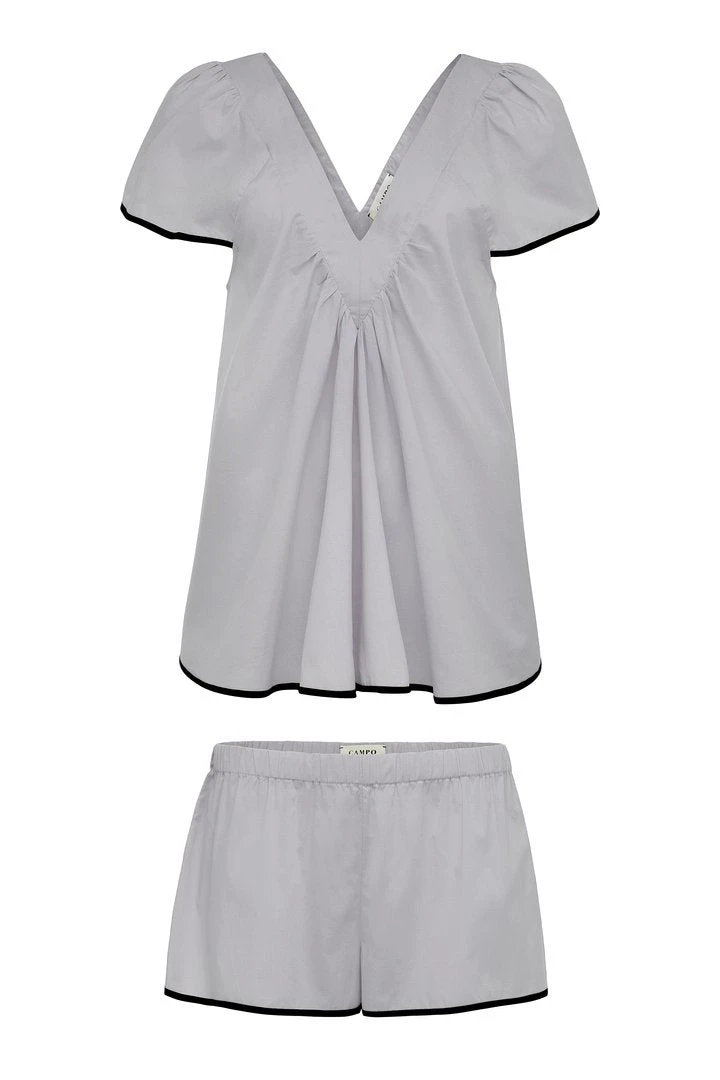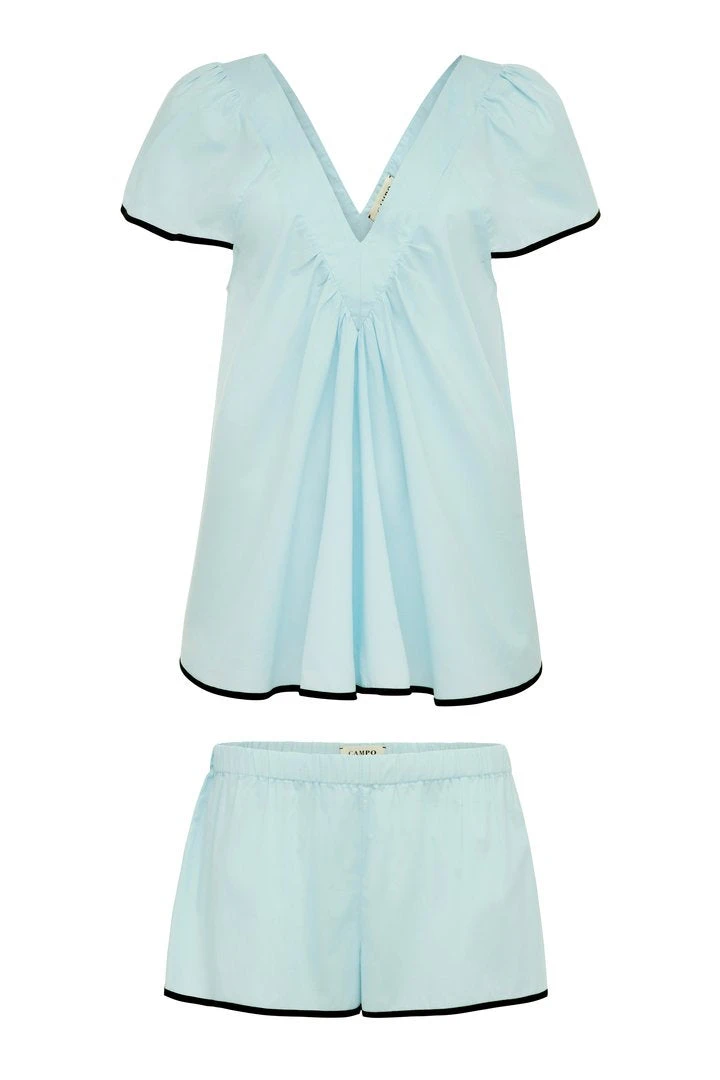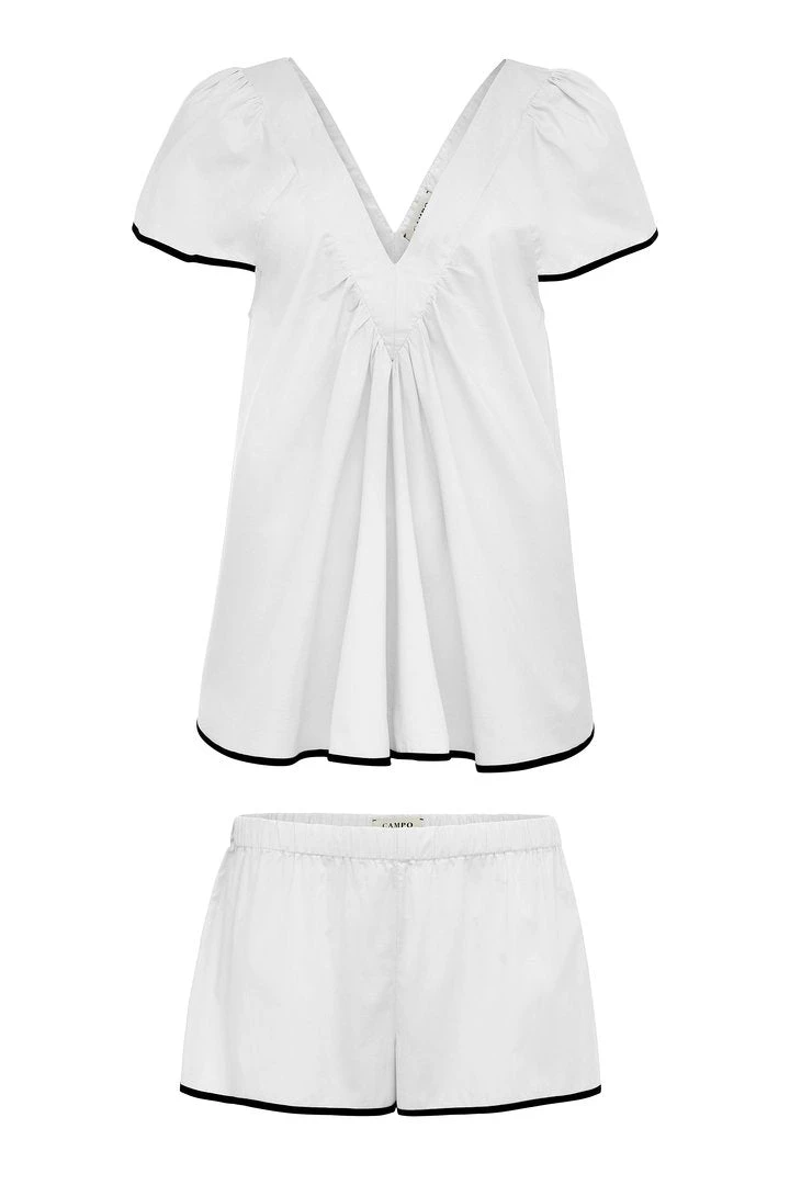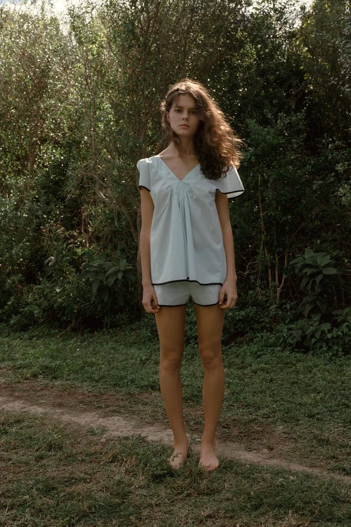 This two-piece set is crafted with the supplest organic cotton batiste. Contrast binding outlines the hems on both the top and bottom. Our Bianca top has elevated sleeves, a slight gathering at the bust for added room, and a v-neckline in the front and back. The shorts feature an elastic waistband to complete this go-to pajama set for a leisurely summer evening.Â