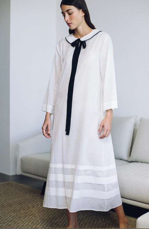 A Peter-pan collar loose nightgown with a black ribbon to tie as you prefer, a small fabric covered button closes the garment in the back. Hanane brings a sophisticated and youthful twist to a classic. Cut from fine organic cotton batiste and finished with a thin black piping around the collar.