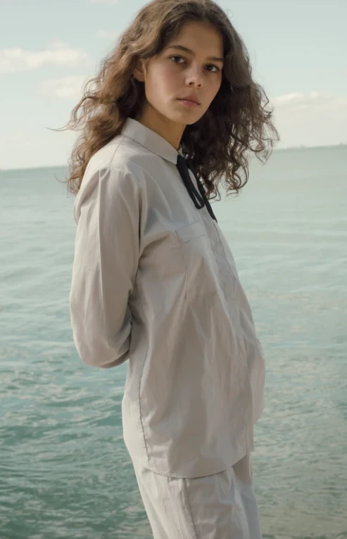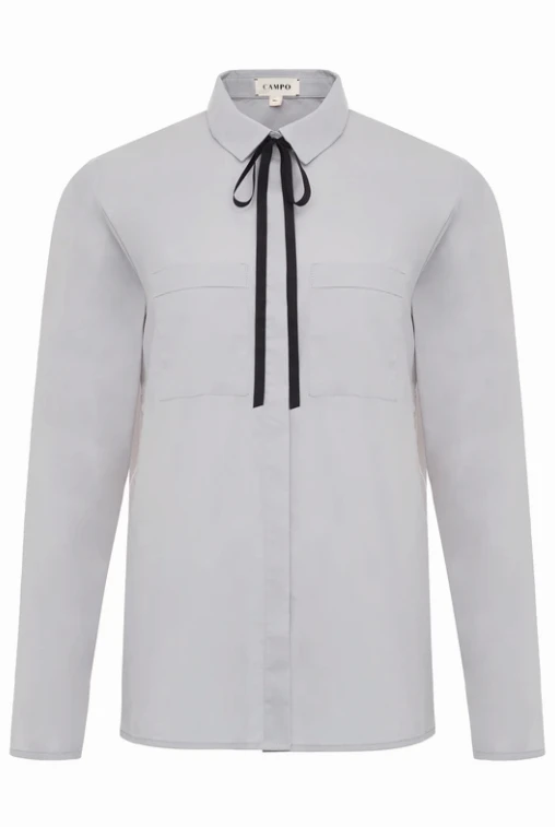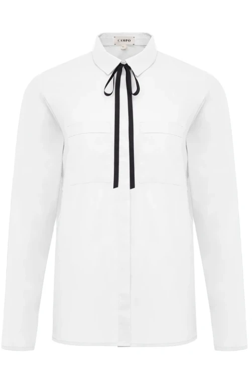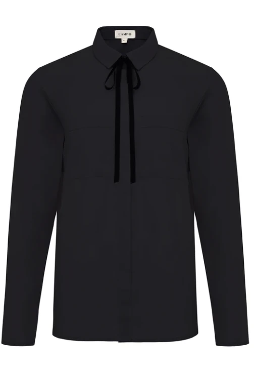 Our nightshirt with a hidden placket and corozo buttons has two top-stitched rectangular patch pockets with a delicate tuck. Mariana has a regular collar and a delicate black ribbon attached around the collar stand. Perfect for a night in or out. Pairs well with the Haley Pant.Â