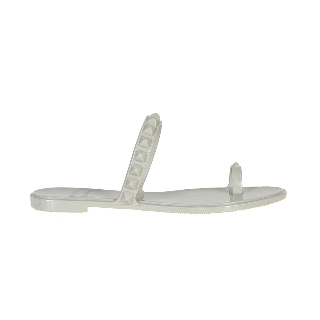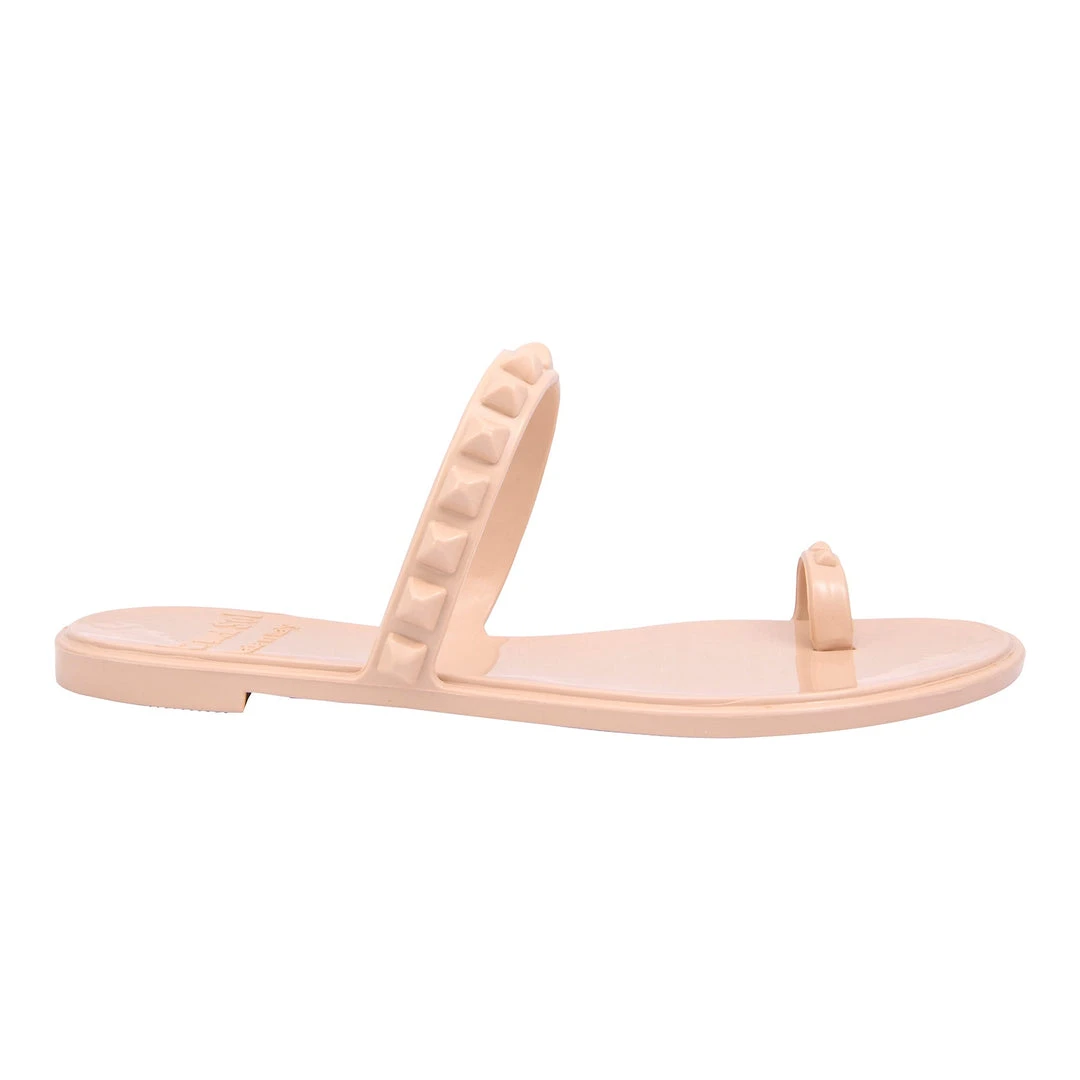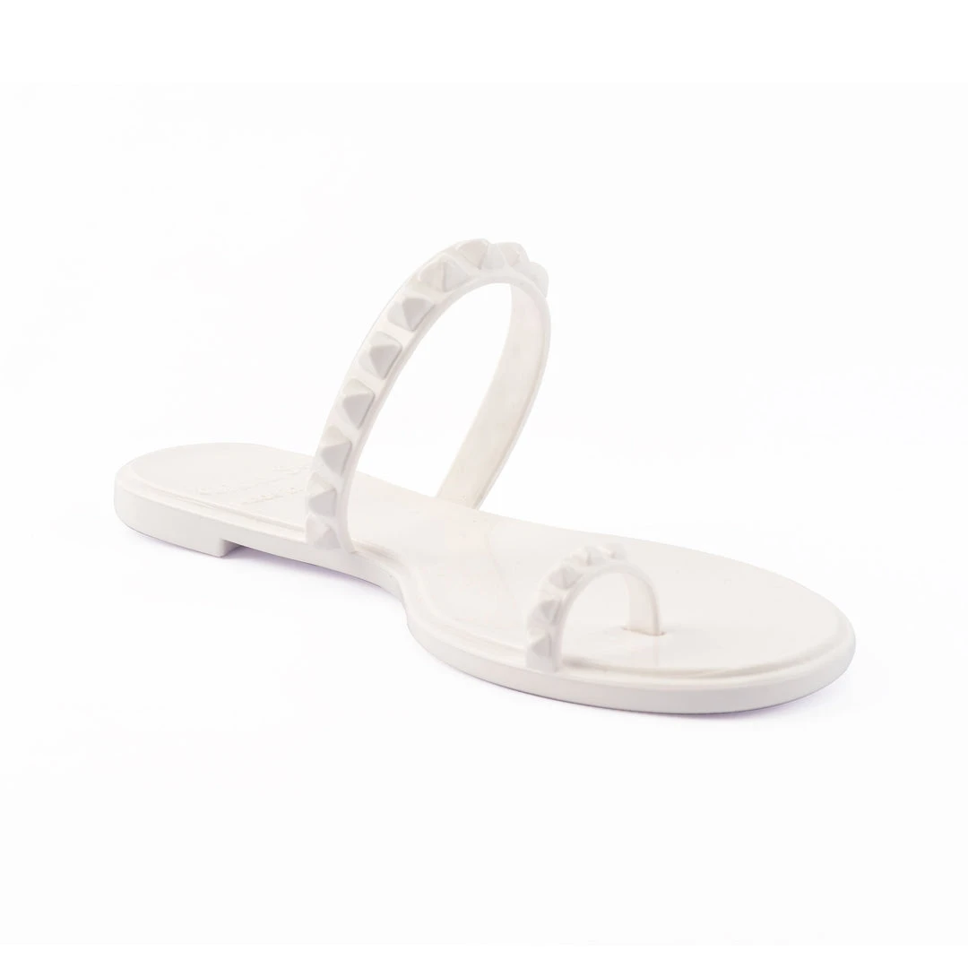- Flat sandal with studded toe ring and studded strap, cushioned inner sole, well-defined ridges on the outsole