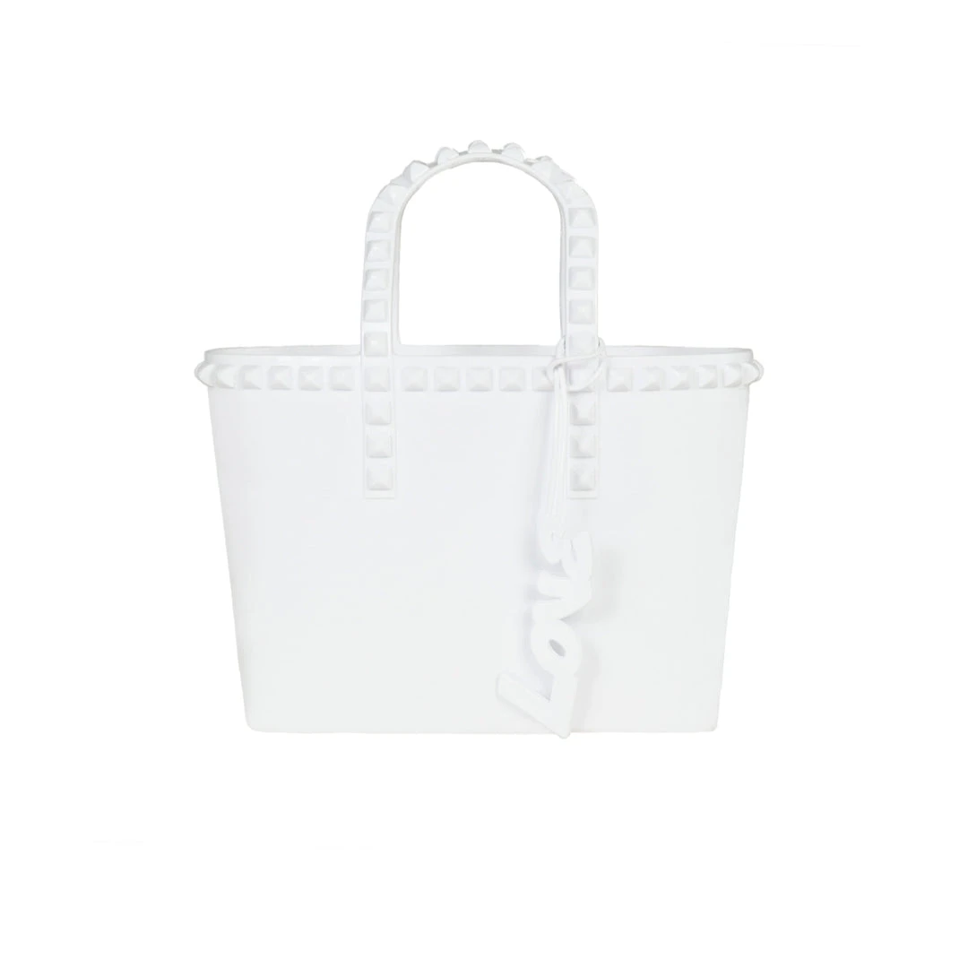 This mini rubber tote bag is perfect for both holding your essentials, or giving your child their first high-fashion jelly bag.