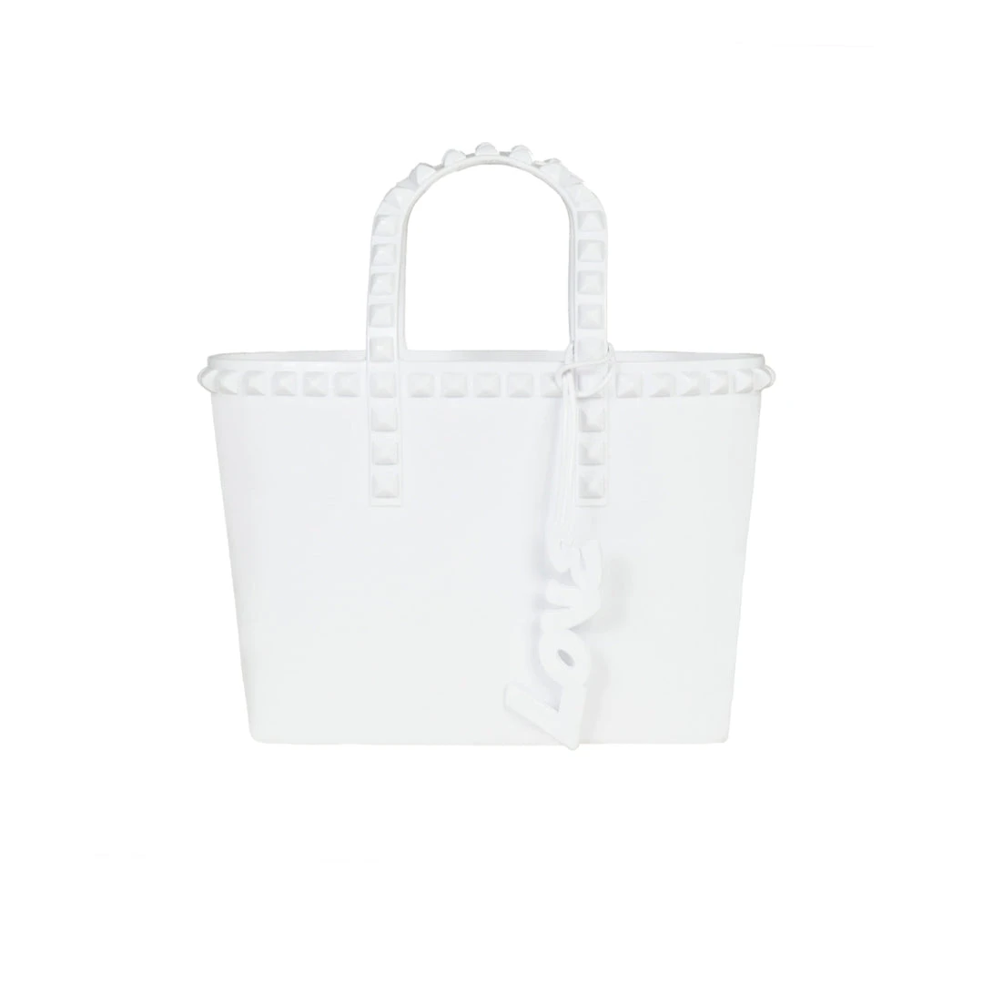 This mini rubber tote bag is perfect for both holding your essentials, or giving your child their first high-fashion jelly bag.