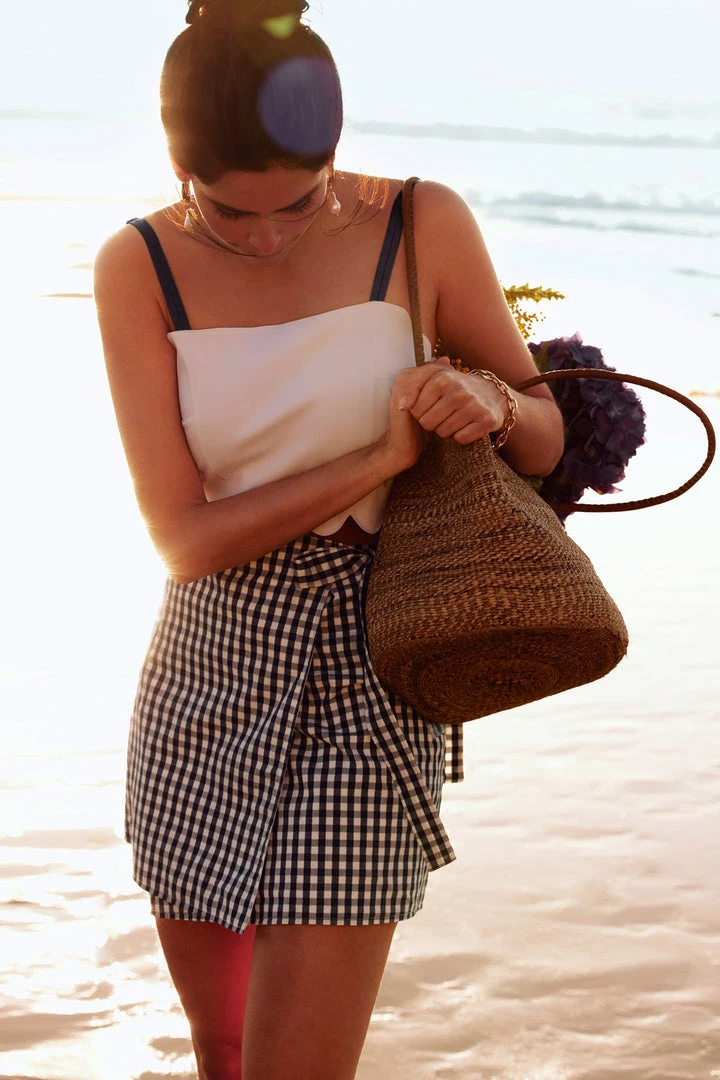 Keep your mementos in the patch pockets of this all-day poplin wrap skirt. The Annabelle is a 100% cotton yarn-dyed gingham with concealed two-button interior fastening and tie at the waist. Contrasting patch pockets make it an easy day-to-night piece. Made in Los Angeles.