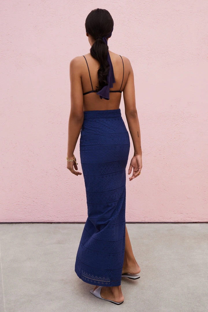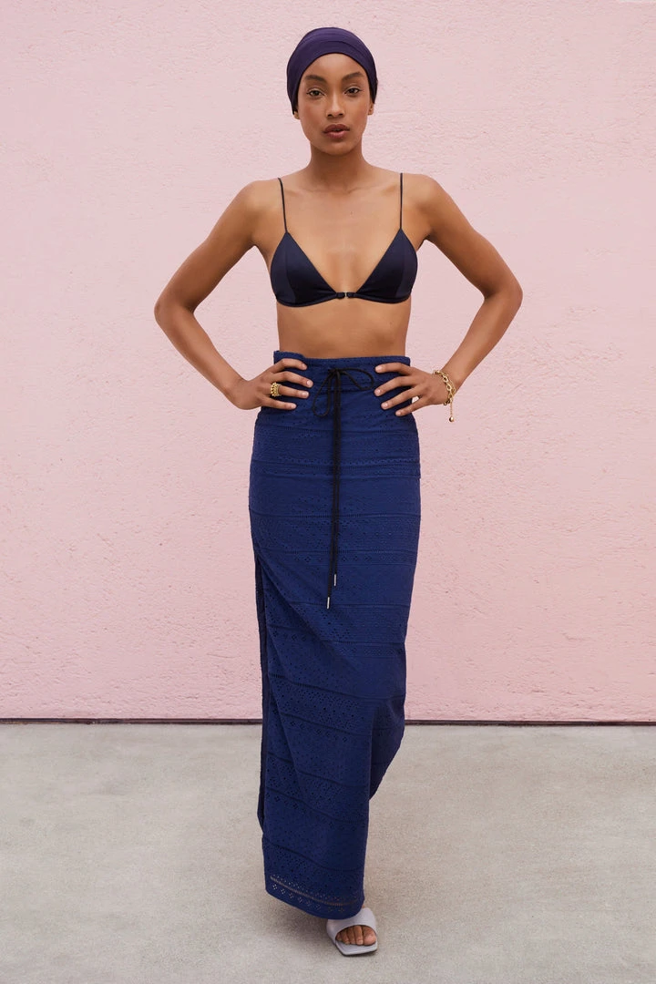 Chic and fitted, The Beatrice offers a high-waist silhouette with a side slit. A metal-tipped cotton belt rope is fed through the fabric’s custom 100% cotton eyelets for the perfect fit. Concealed zip fastening. Made in Los Angeles.