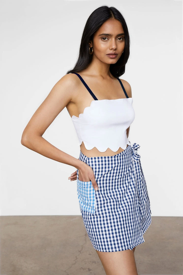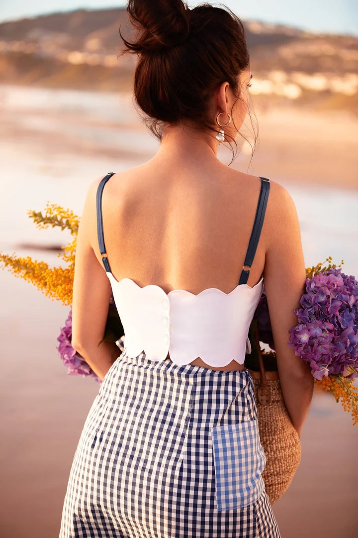Inspired by Slim Aaron’s photography and made for cocktails on the beach, this scallop crop-top offers an extra dose of vintage tennis fashion. Brigitte is made in a comfortable stretch-cotton fabric that contours to the body. She features adjustable hand-dyed contrasting straps from France and a scalloped overlapping back closure fastened with three pearl buttons. Each scallop is individually cut and hand sewn in Los Angeles.