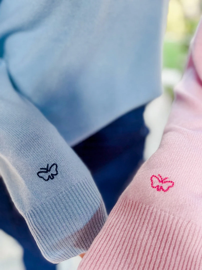 This style features a flattering crewneck neckline in Light Blue Cashmere.Â