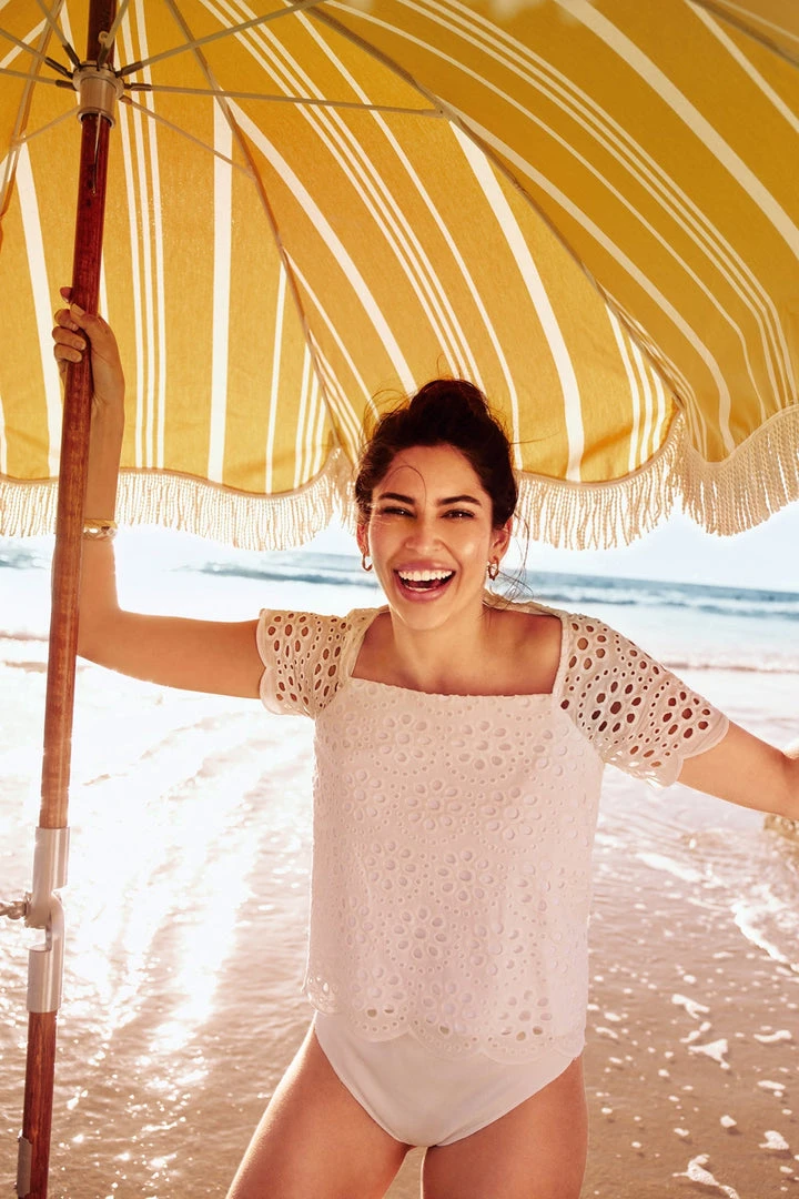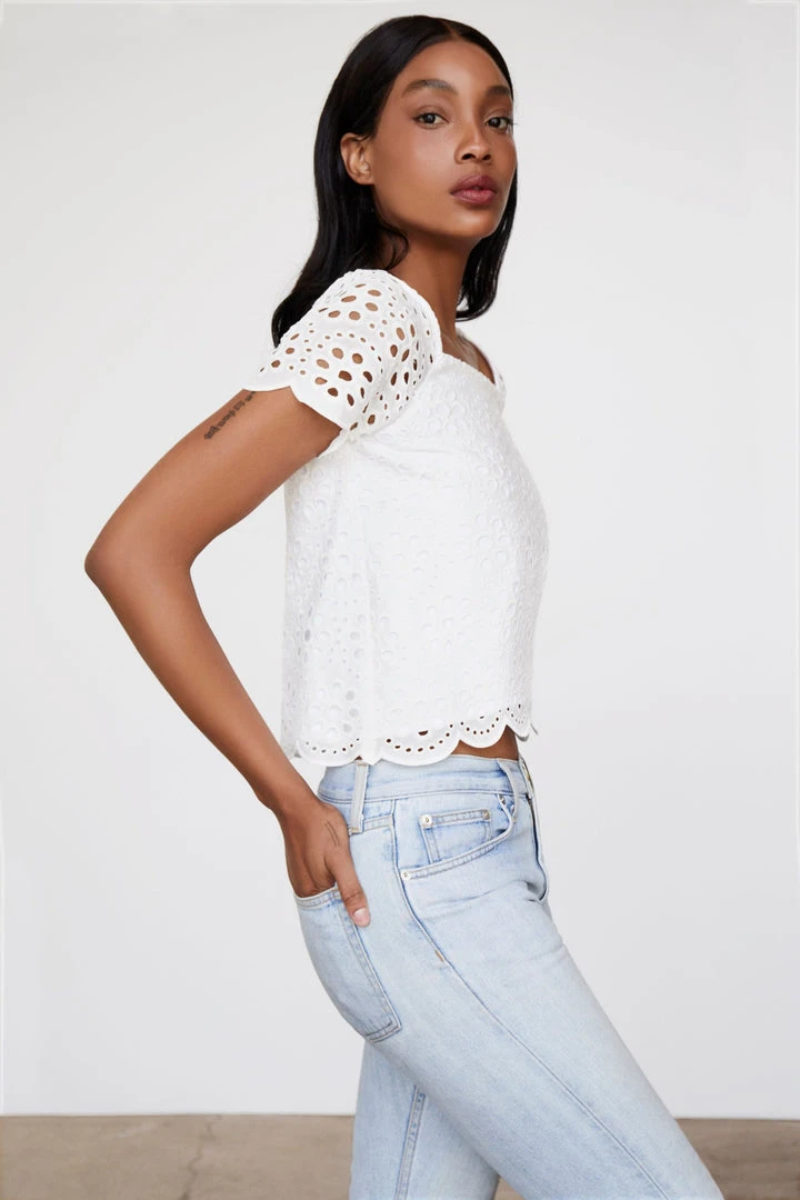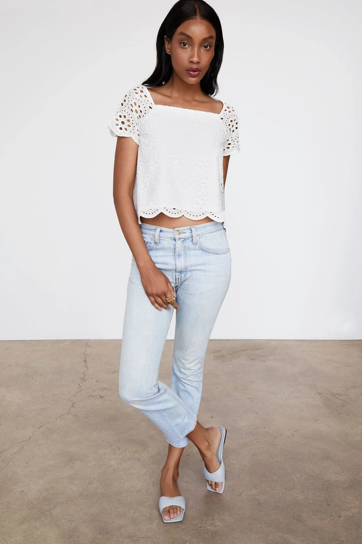 A chic and easy slip-on for any shape. The Gillian features 100% cotton eyelet embroidery with a square neckline and scalloped sleeve and hem. A keyhole, unique scallop yoke detail, and pearl button closure complete the back. Hand dyed and sewn in Los Angeles.