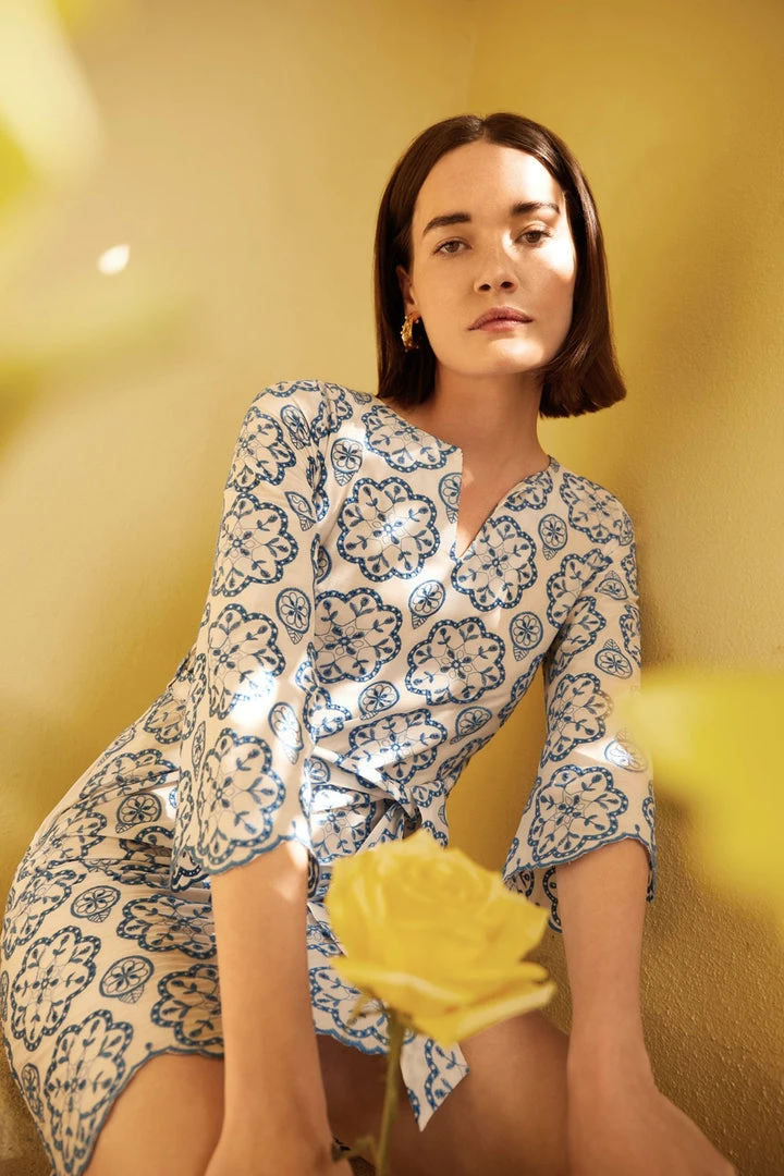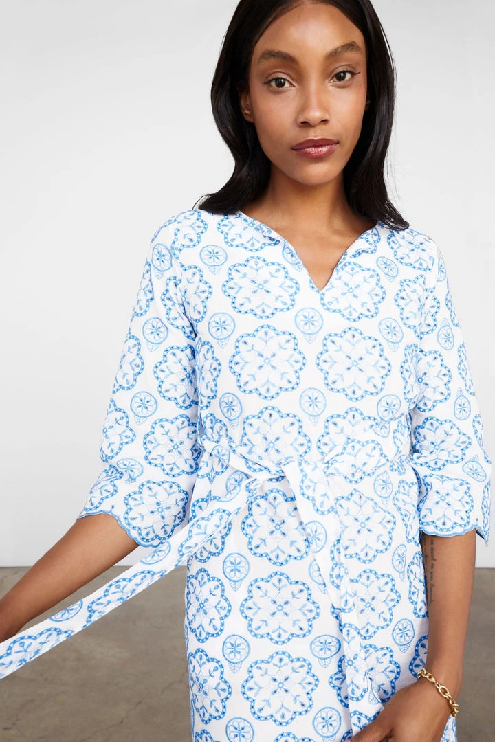 There’s sun-shiny optimism from inch-to-inch of our custom cotton eyelet Lemon embroidery. The Margaret is a chic and easy coverup or day dress with pockets and a removable waist sash. Features scallops on the sleeve and hem. Made in Los Angeles.