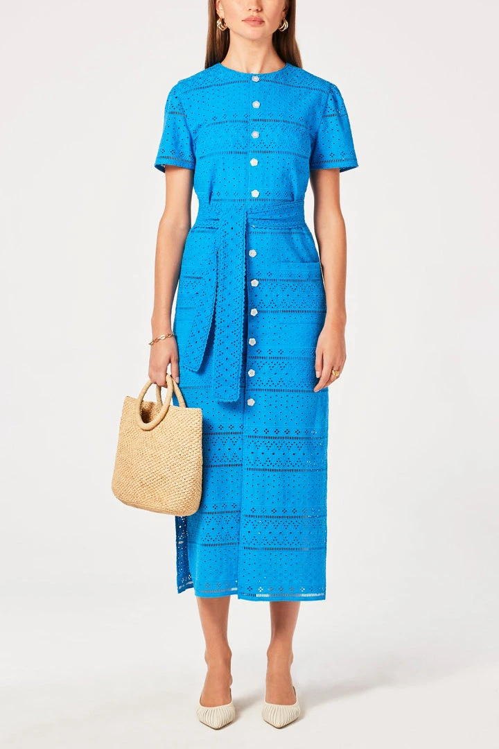 Next-level sophistication. Chic removable belt adjusts to cinch waist as desired for the most flattering fit. Ophelia features opalescent buttons, hip pockets, two slits, and lining to the knee. 100% breathable embroidered cotton. Designed, dyed, and sewn in Los Angeles.
