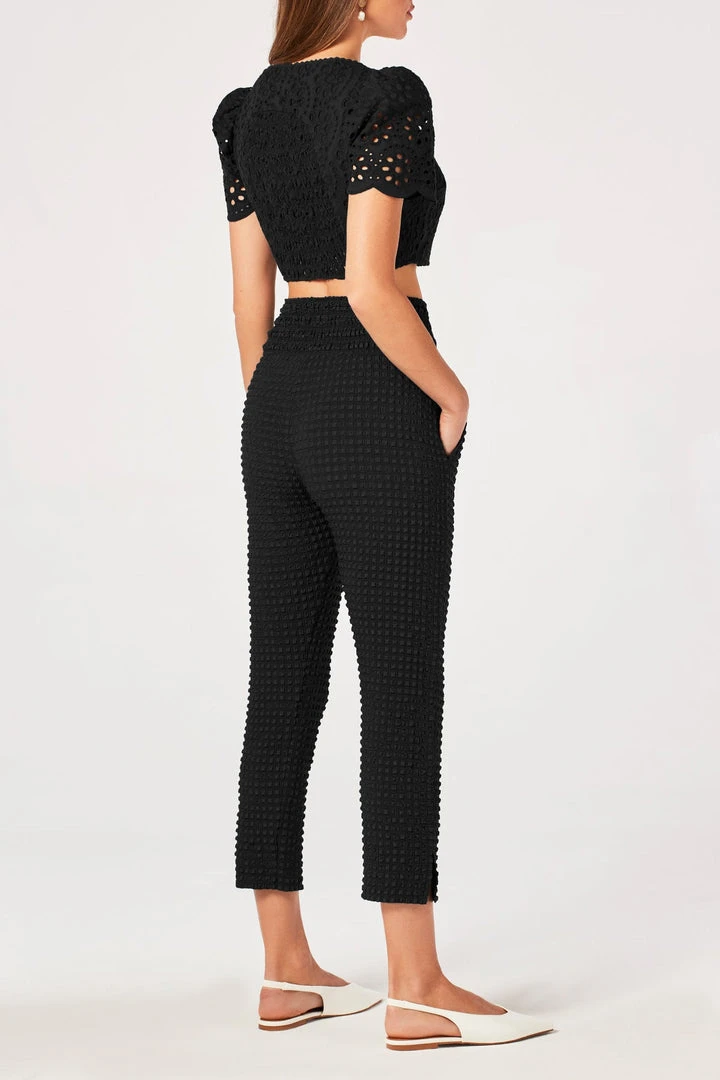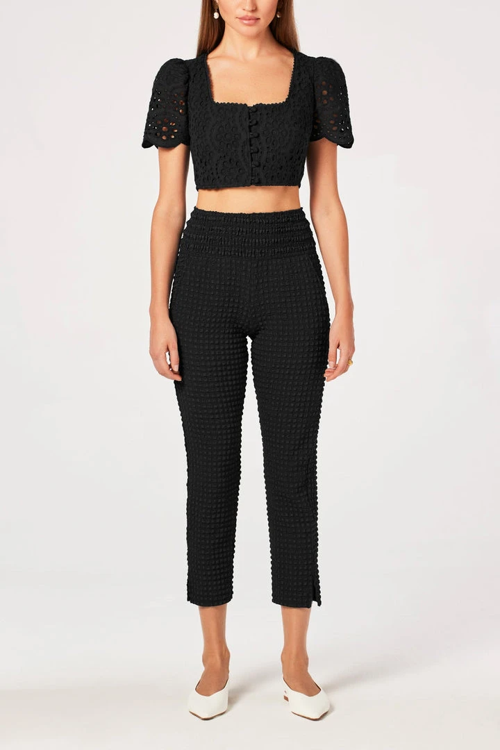 Inspired by the tailored style of our favorite princess. This update of our original Diana design keeps the Capri silhouette and introduces a smocked waistband for a comfortable pant that’s easy to wear. Features hem vents and pockets. 100% breathable waffle fabric with stretch. Designed and sewn in Los Angeles.