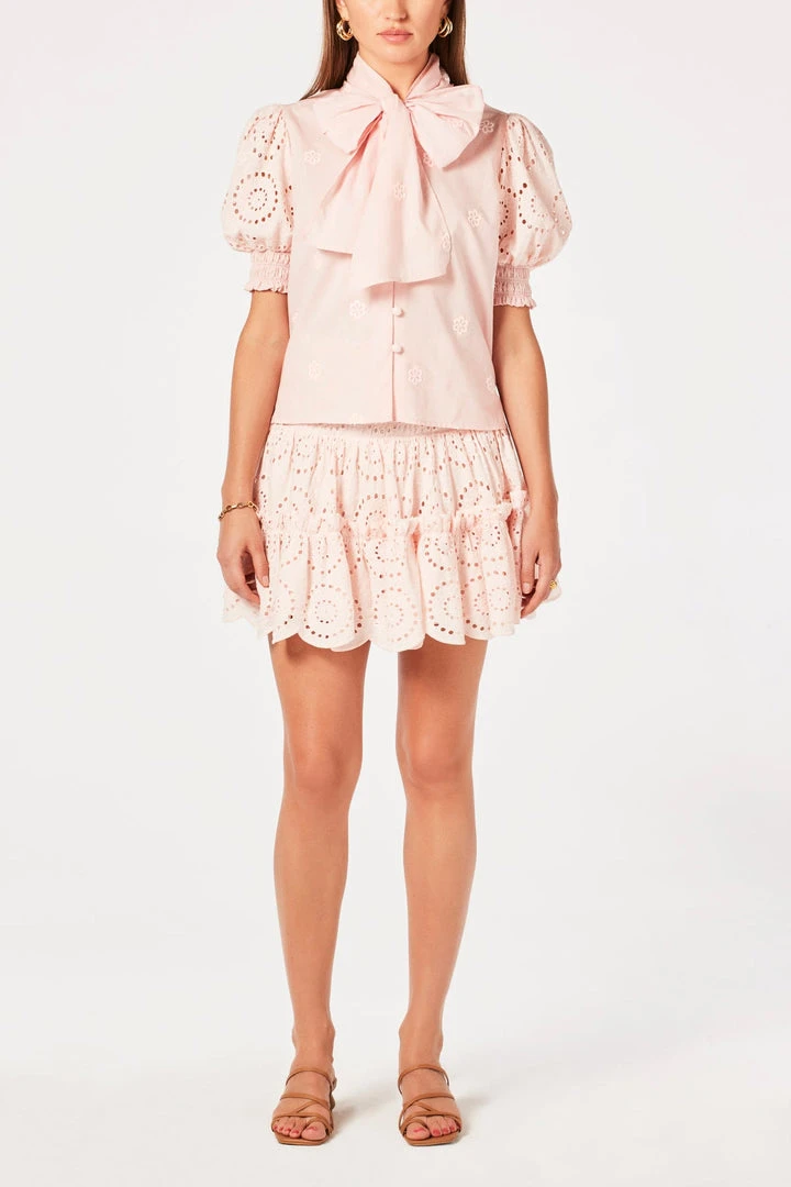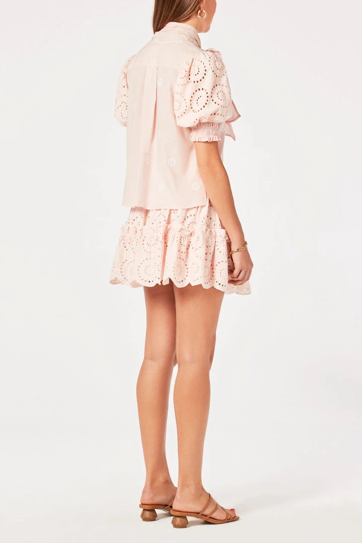 Feminine silhouette featuring a cinched smock waistband for premium comfort. Kylie offers a scalloped hem and 100% breathable embroidered cotton from China. Designed, dyed, and sewn in Los Angeles.