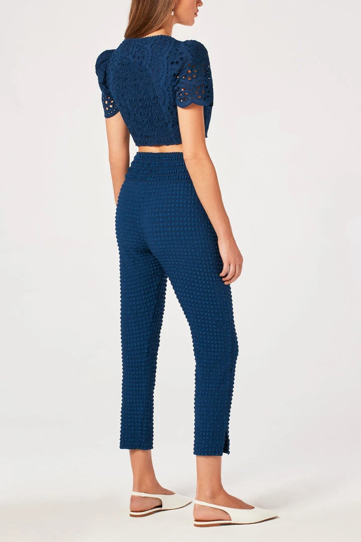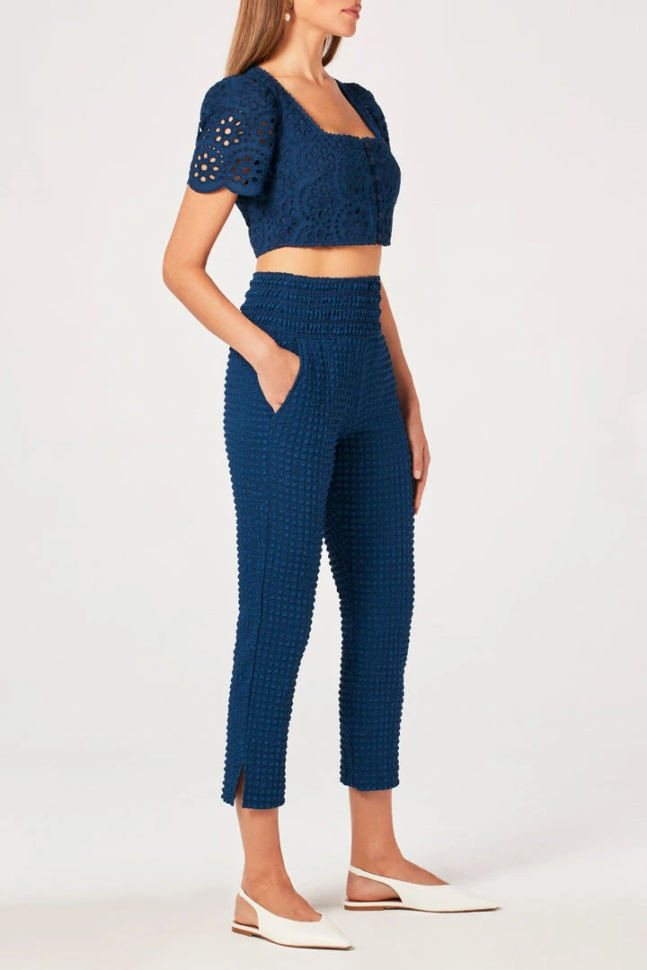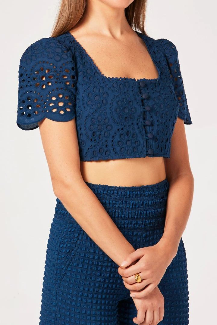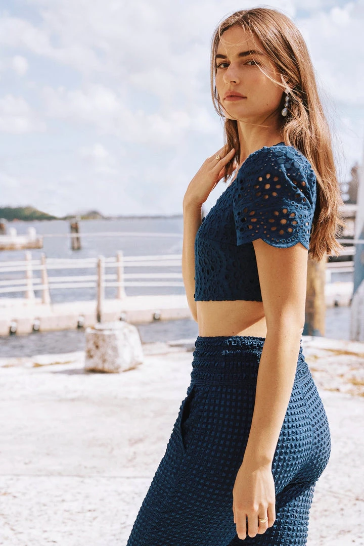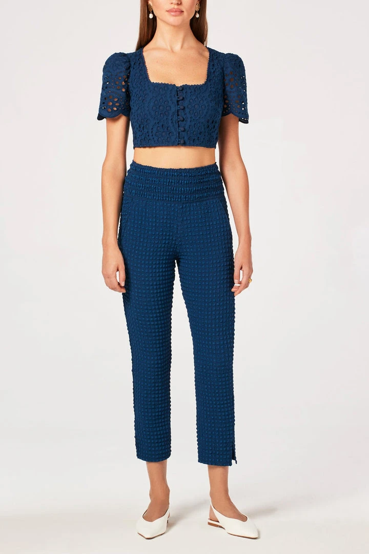 Channel your inner Bardot with a ‘60s-inspired silhouette. Smocked back offers comfort and the perfect fit. Finished with cotton trim neckline and functioning covered buttons and loops. 100% cotton eyelet. Designed, dyed, smocked, and sewn in Los Angeles.