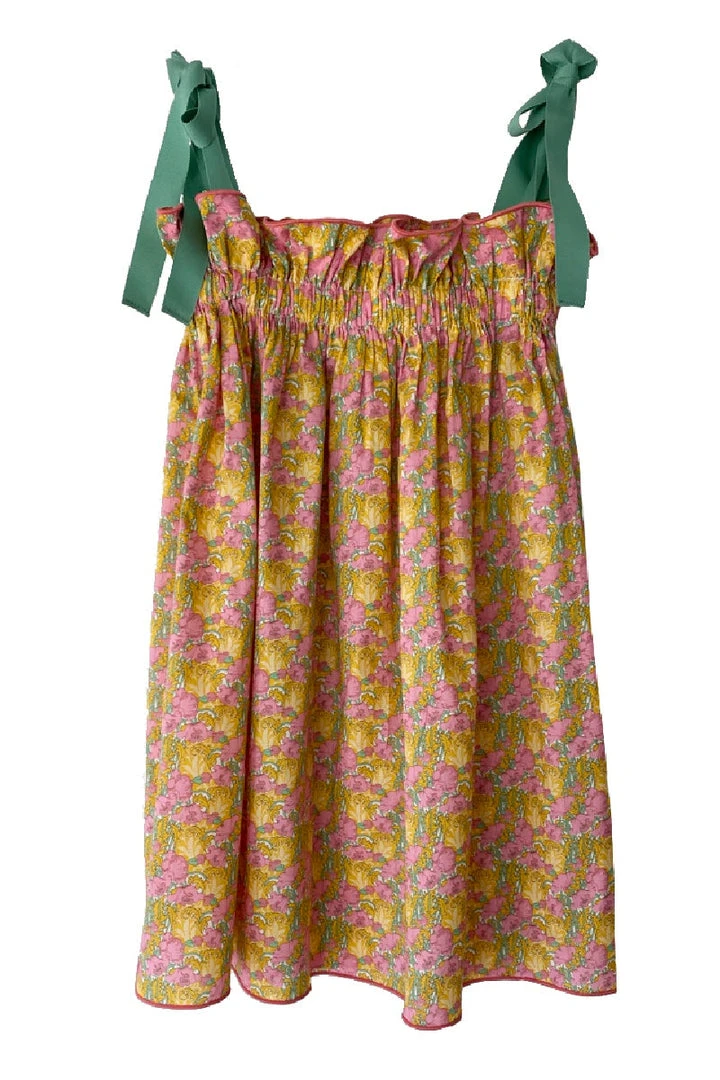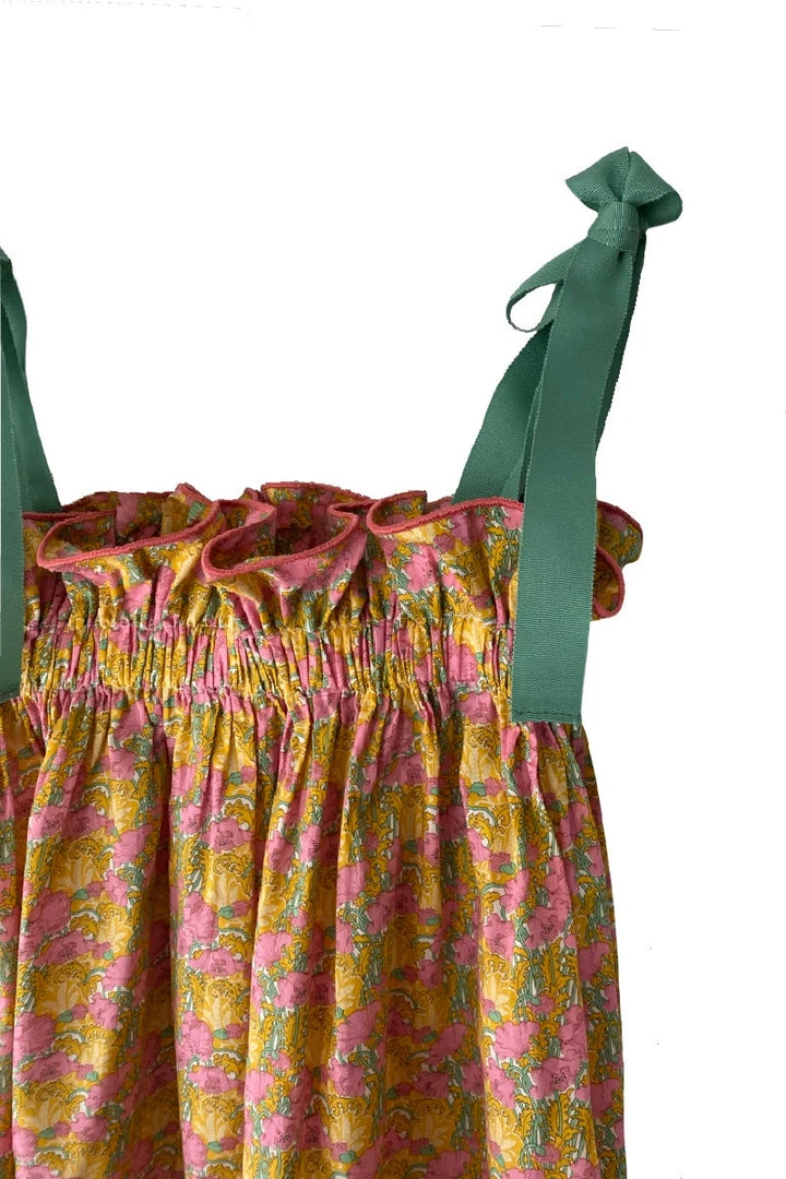Our beloved Jaime dress is now available for girls. Silky, lightweight cotton, grosgrain straps that tie at the shoulders, and embroidered piping along the top edge of the ruffle make this dress adjustable, comfortable, and lovely.