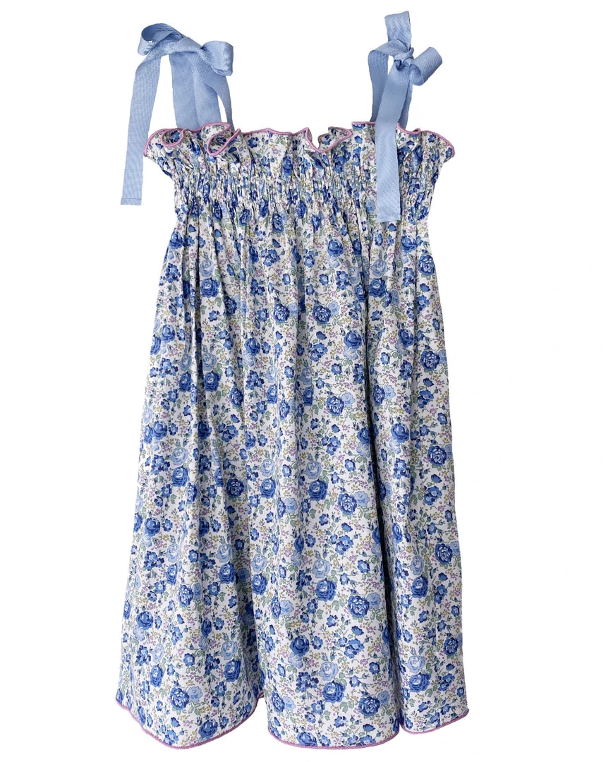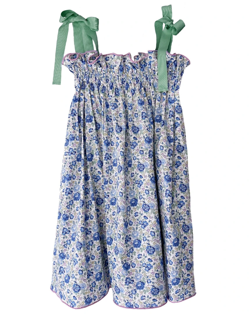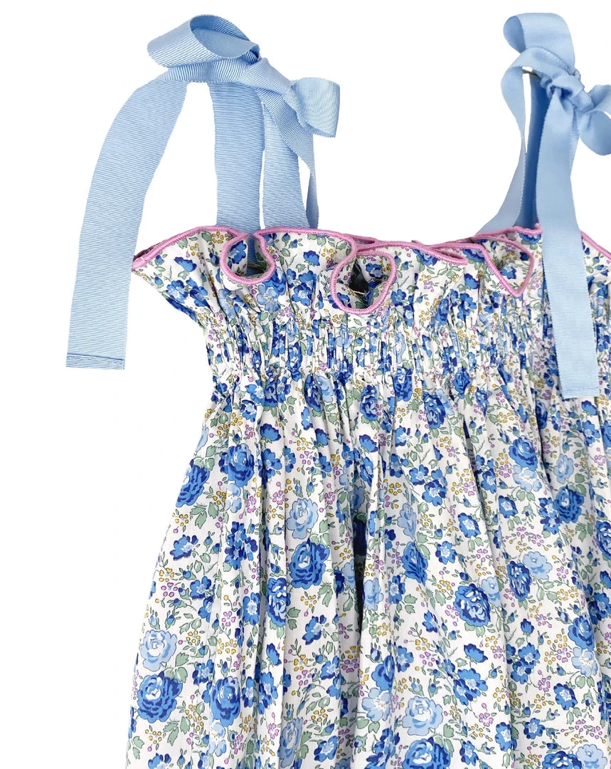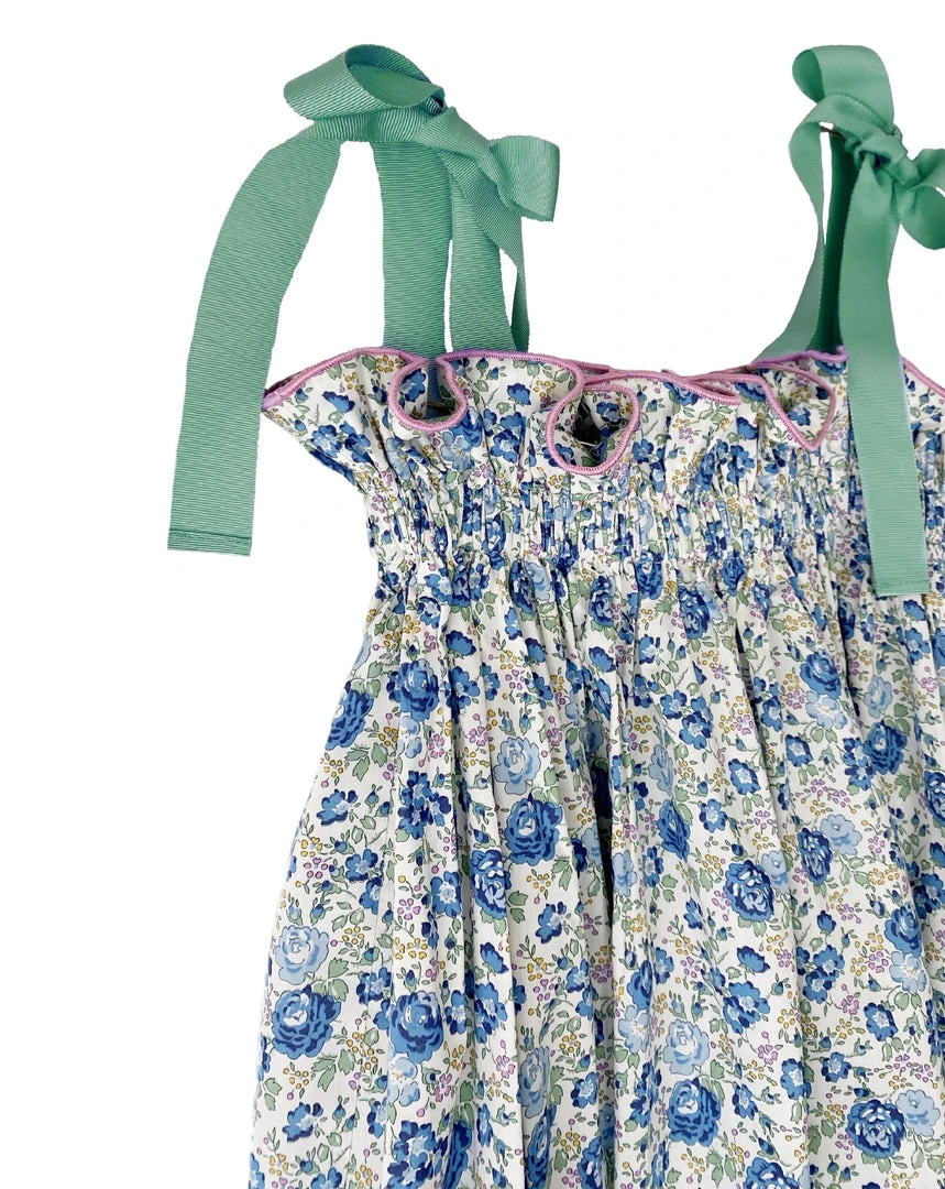 Our beloved Jaime dress is now available for girls. Silky, lightweight cotton from Liberty Fabrics, grosgrain straps that tie at the shoulders, and embroidered piping along the top edge of the ruffle make this dress adjustable, comfortable, and lovely.