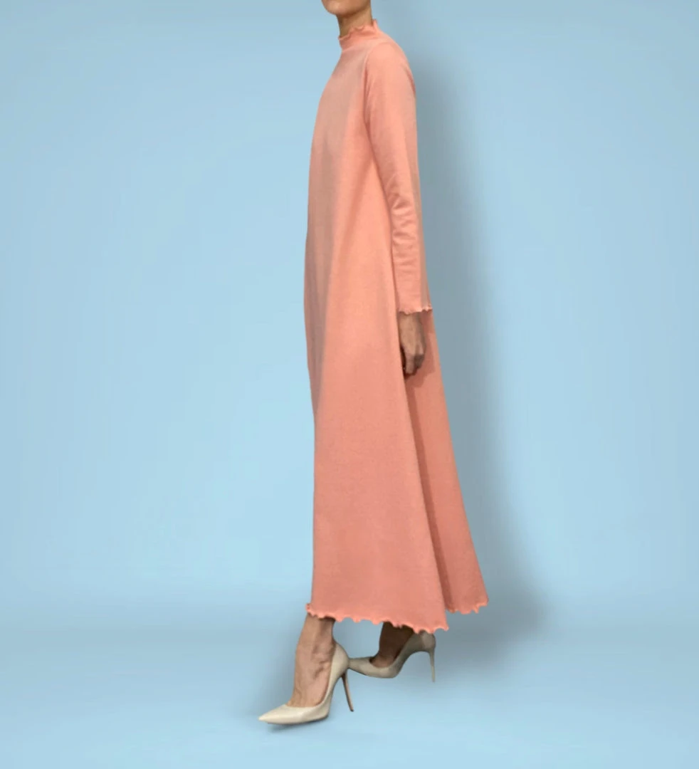 - Salmon-colored, medium-weight French terry dress with raised neckline and embroidered lettuce edges