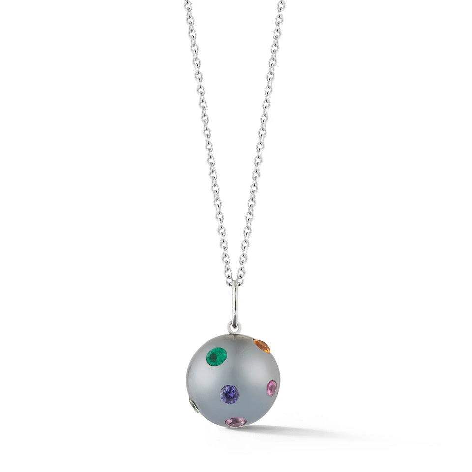 Twelve sapphires grace the surface of this baroque pearl making a one-of-a-kind piece every time.Â