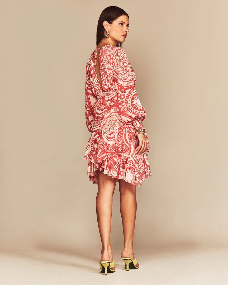 This mini dress features our exclusive custom CS Mandala print. Detailed with an airy sleeve detail, an elastic wrist, finished with a ruffled skirt.