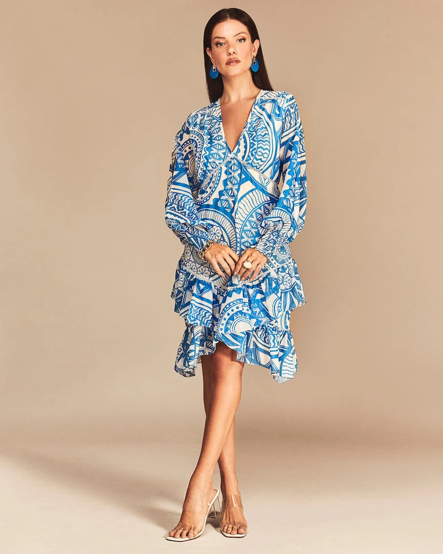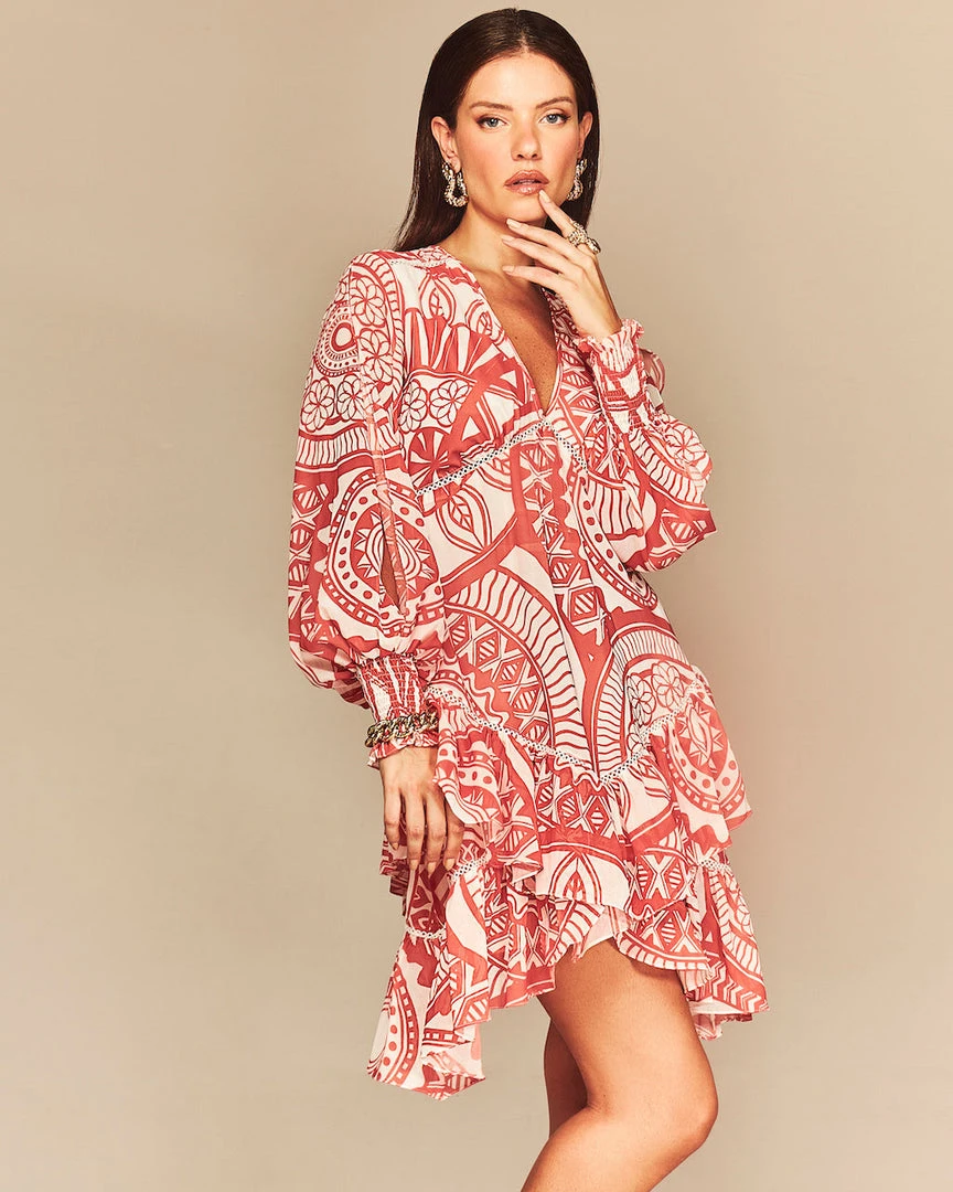 This mini dress features our exclusive custom CS Mandala print. Detailed with an airy sleeve detail, an elastic wrist, finished with a ruffled skirt.