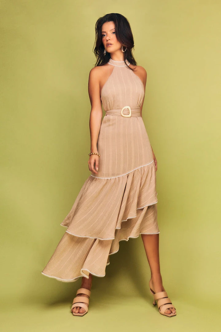 This classic maxi dress features a flattering smocked high-neckline, ruffle skirt, and comes with our classic bamboo buckle.
