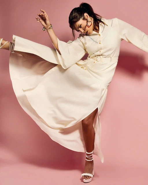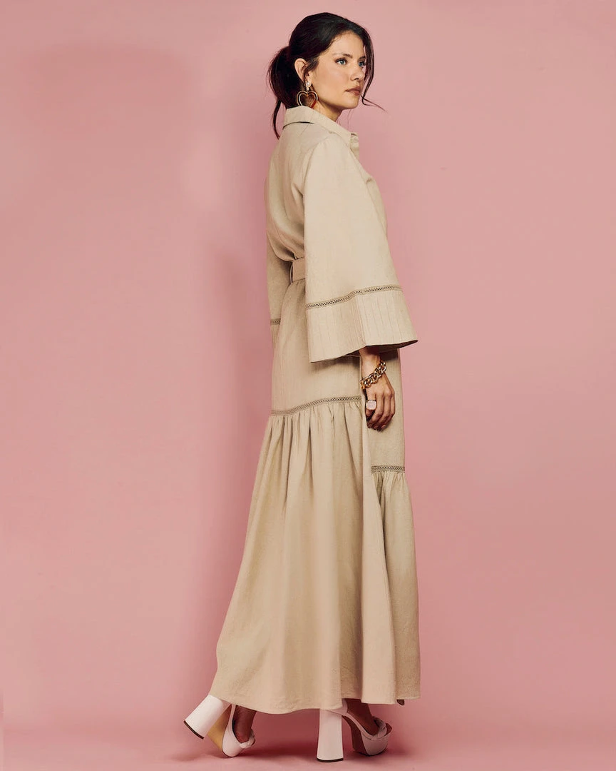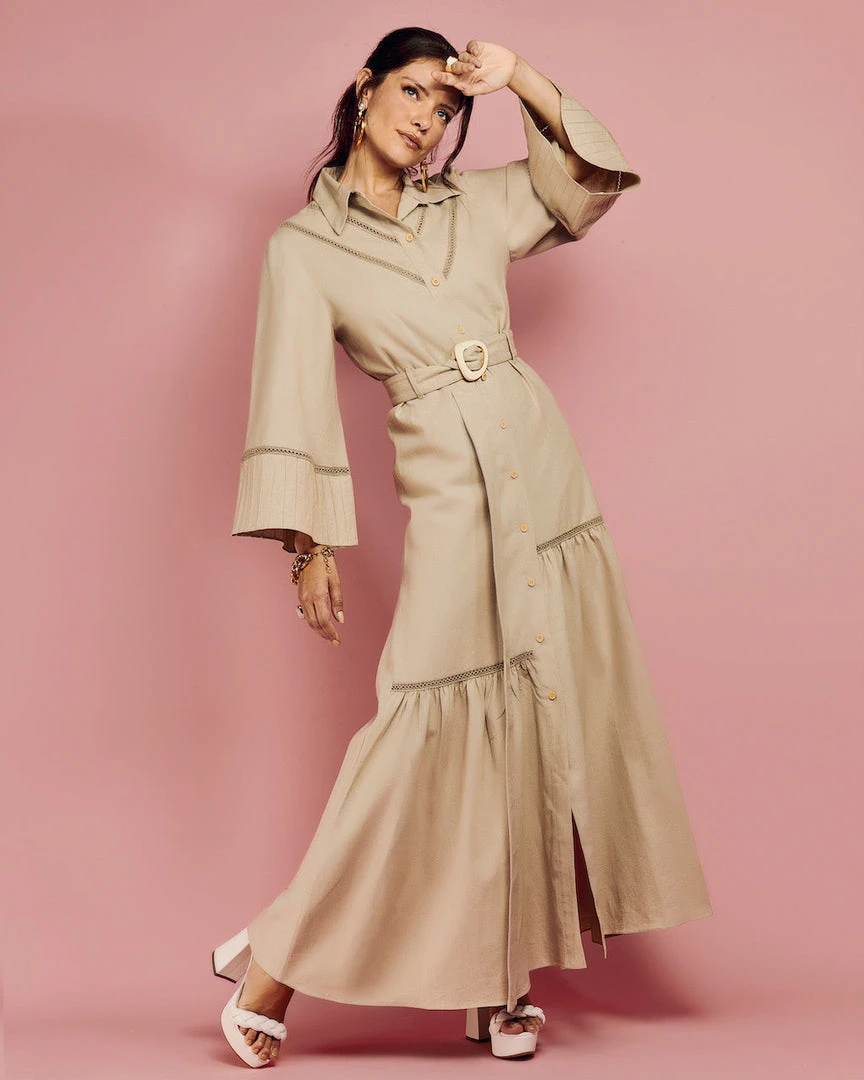 This maxi dress features airy bell sleeves, a collared neckline with a button up detail. Paired with a bamboo buckle belt.