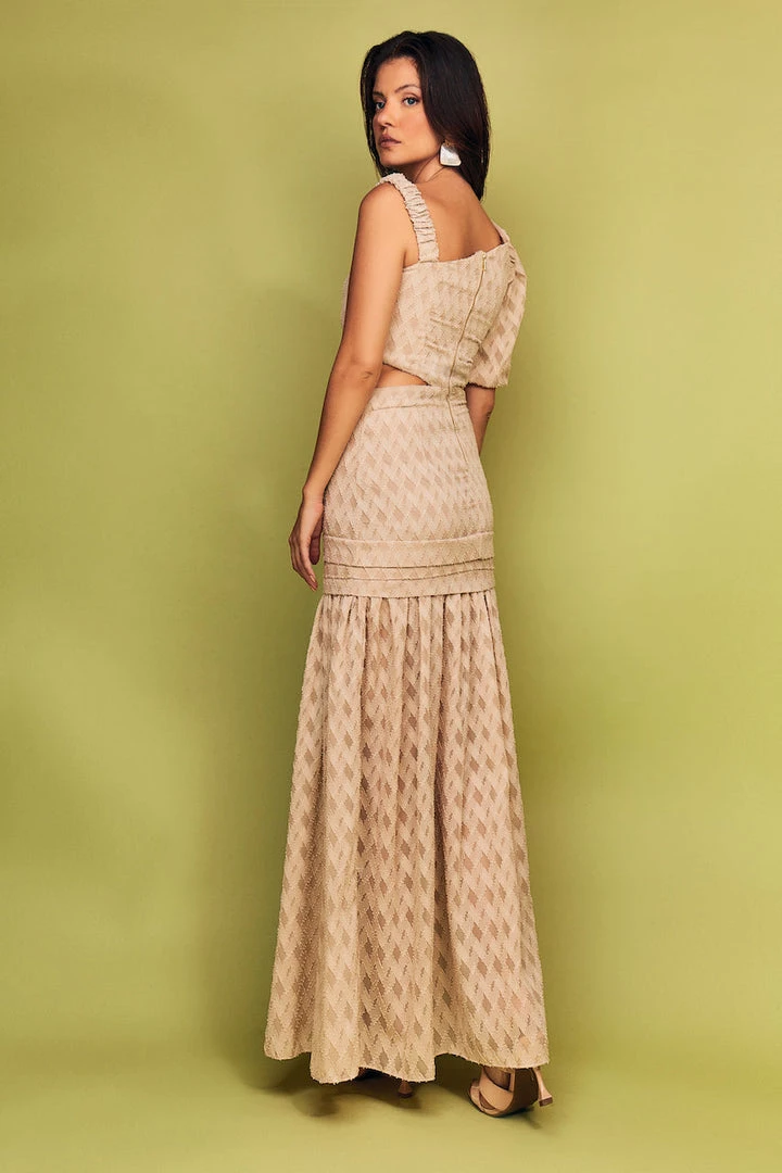 This elegant asymmetrical maxi dress, features a unique puff shoulder and open shoulder strap, as well as side cut-out. The flowy skirt has incredible textured material and an airy slide split.