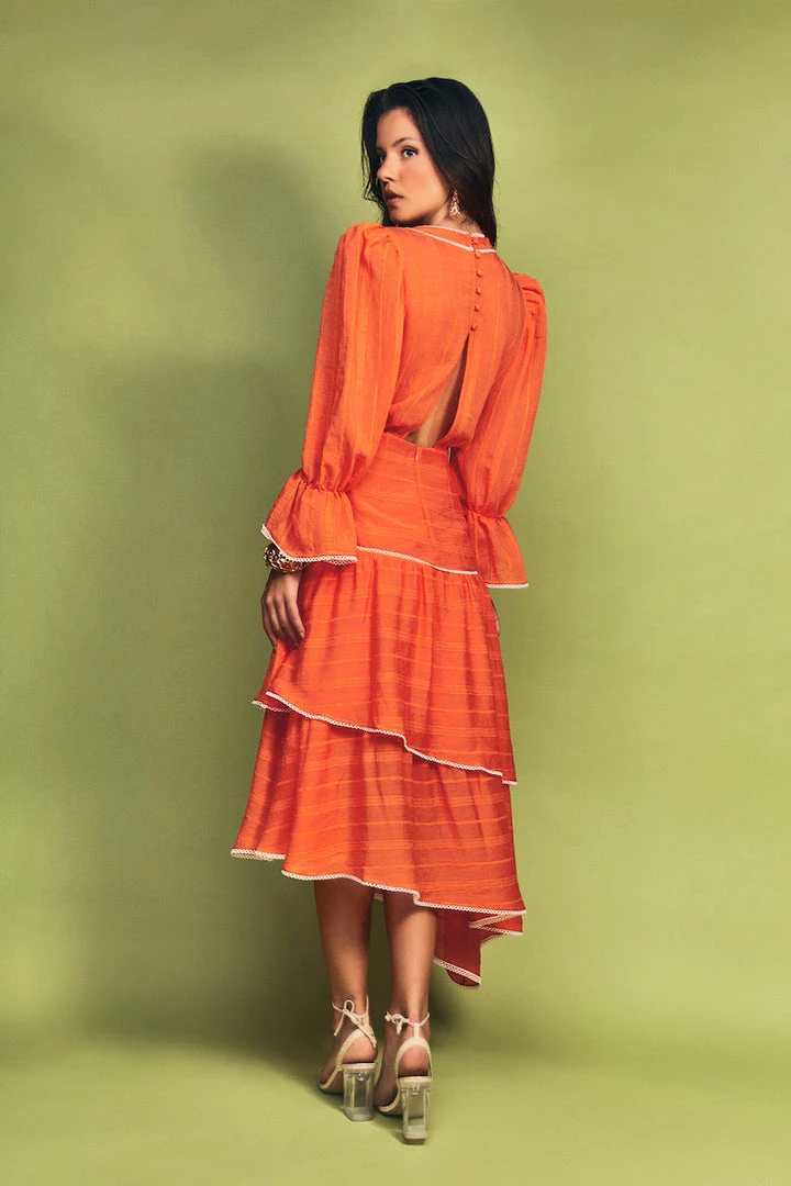 This gorgeous midi maxi dress features a v-neckline, elastic puff wrist, structured shoulders, and ruffled and layered skirt.