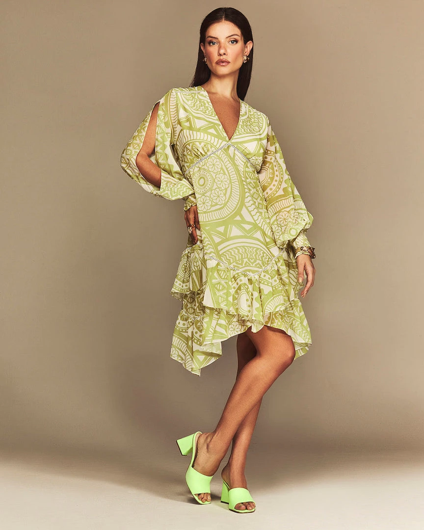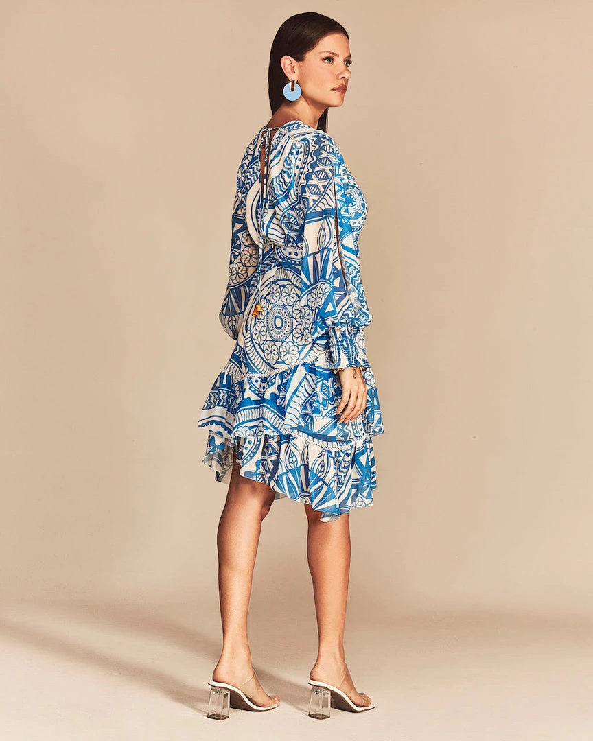 This mini dress features our exclusive custom CS Mandala print. Detailed with an airy sleeve detail, an elastic wrist, finished with a ruffled skirt.