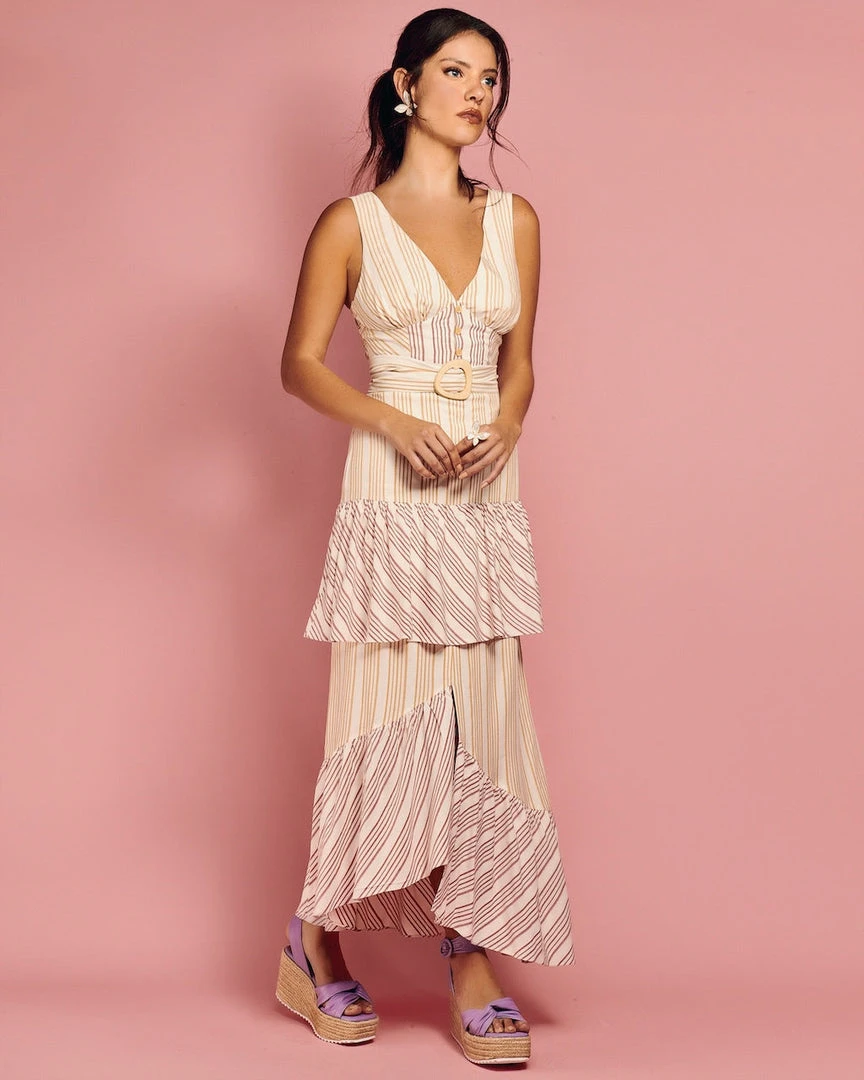 This sleeveless plunging neckline dress, features ruffled layered skirt and comes with a bamboo buckle belt.