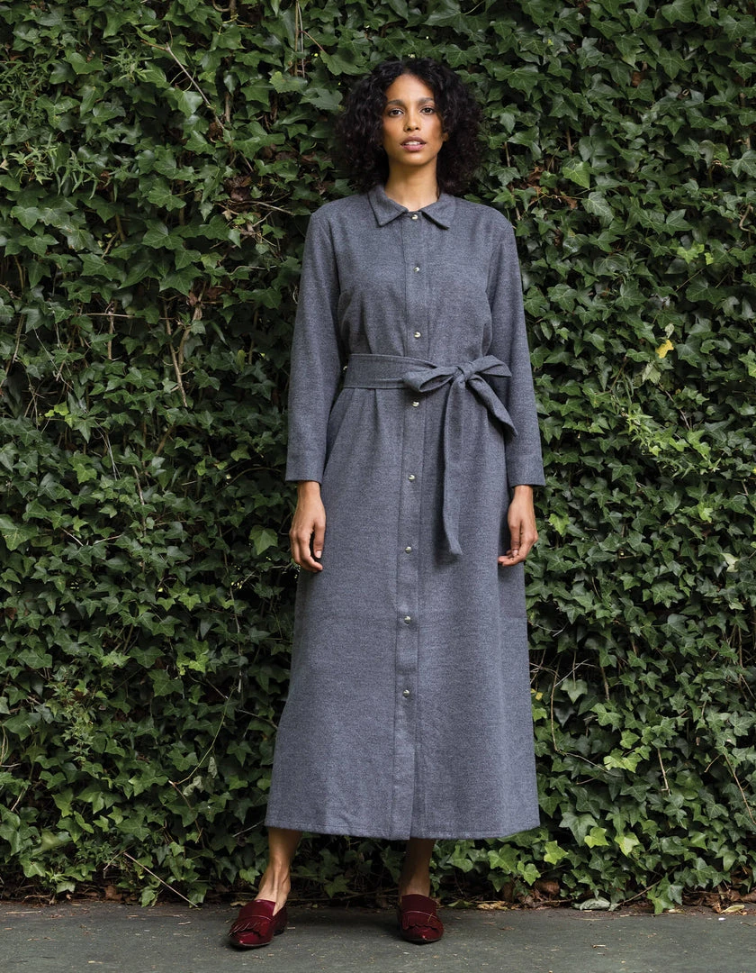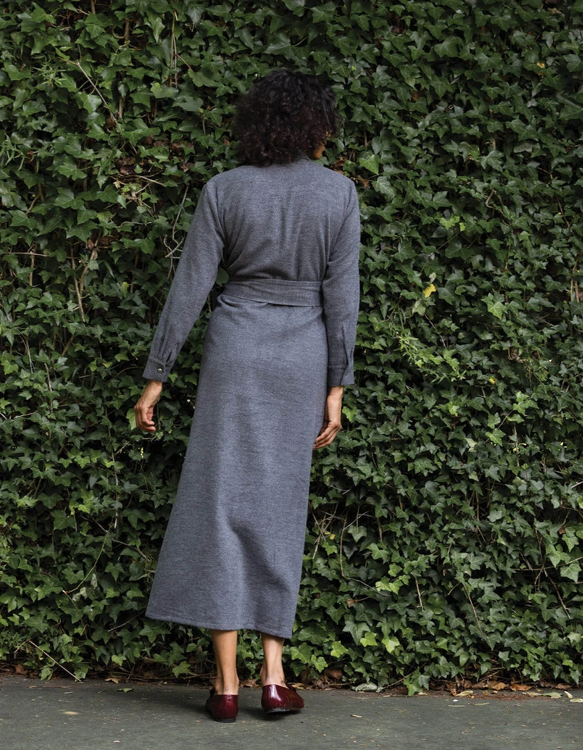 You asked, we answered, and created a longer, leaner version of our original Stella. The Bee is a classic shirtdress that marries femininity with functionality. The charcoal grey is a comfortable viscose blend that you would swear was wool but is machine washable