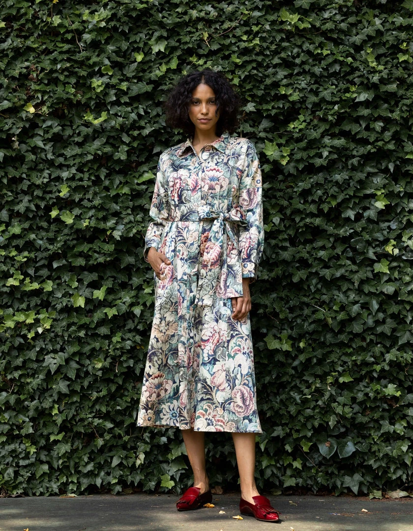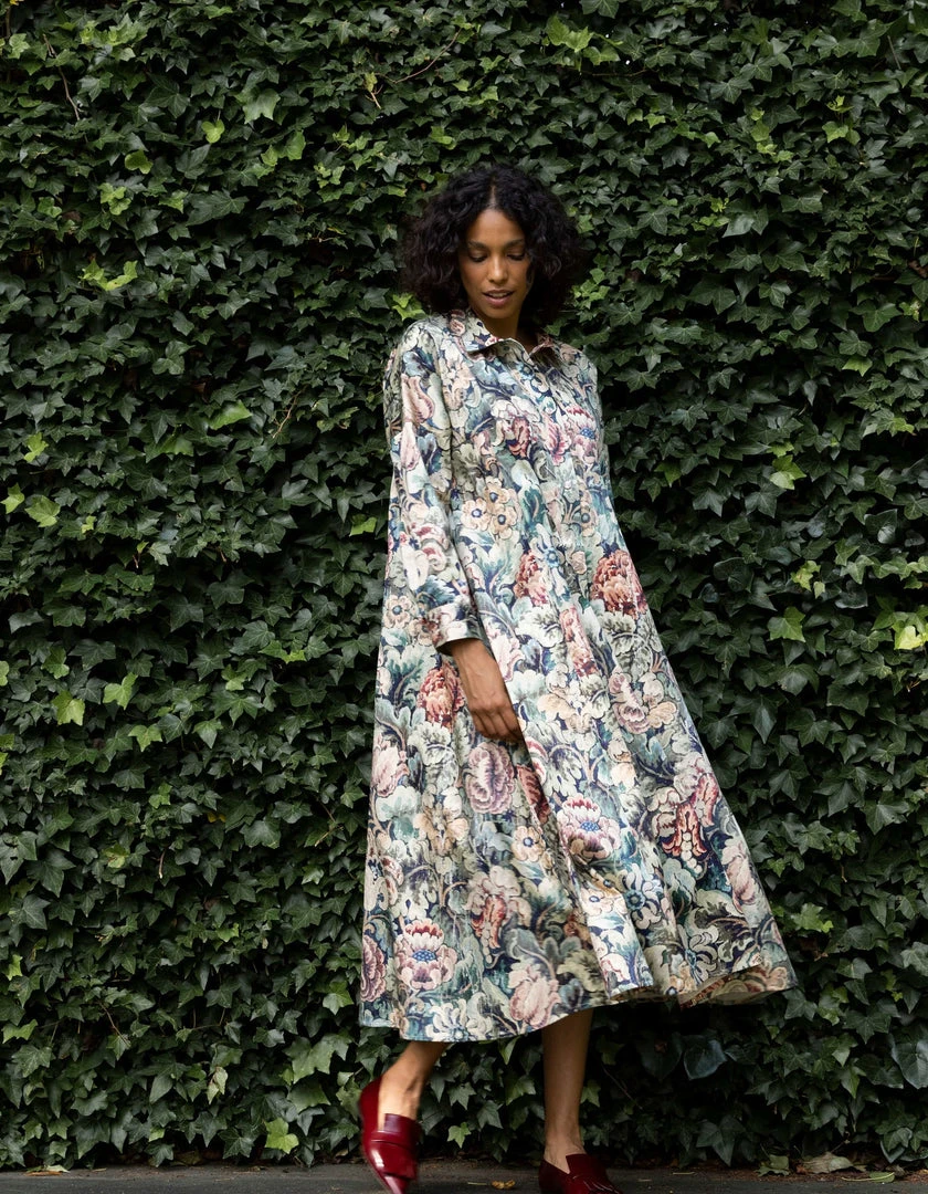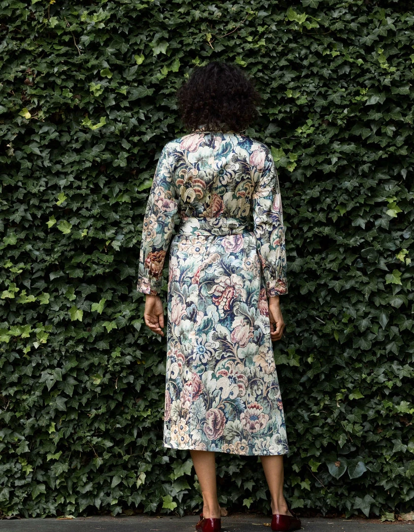 This style borrows certain elements from the boys but as we know, anything they can do, we can do better. The Stella provides a perfect blend of structure and softness and is destined to become your off-duty uniform. Dressed up or dressed down, it’s one of our go-tos.  The romantic floral tapestry print is custom printed on high quality cotton at a storied Italian mill.Â