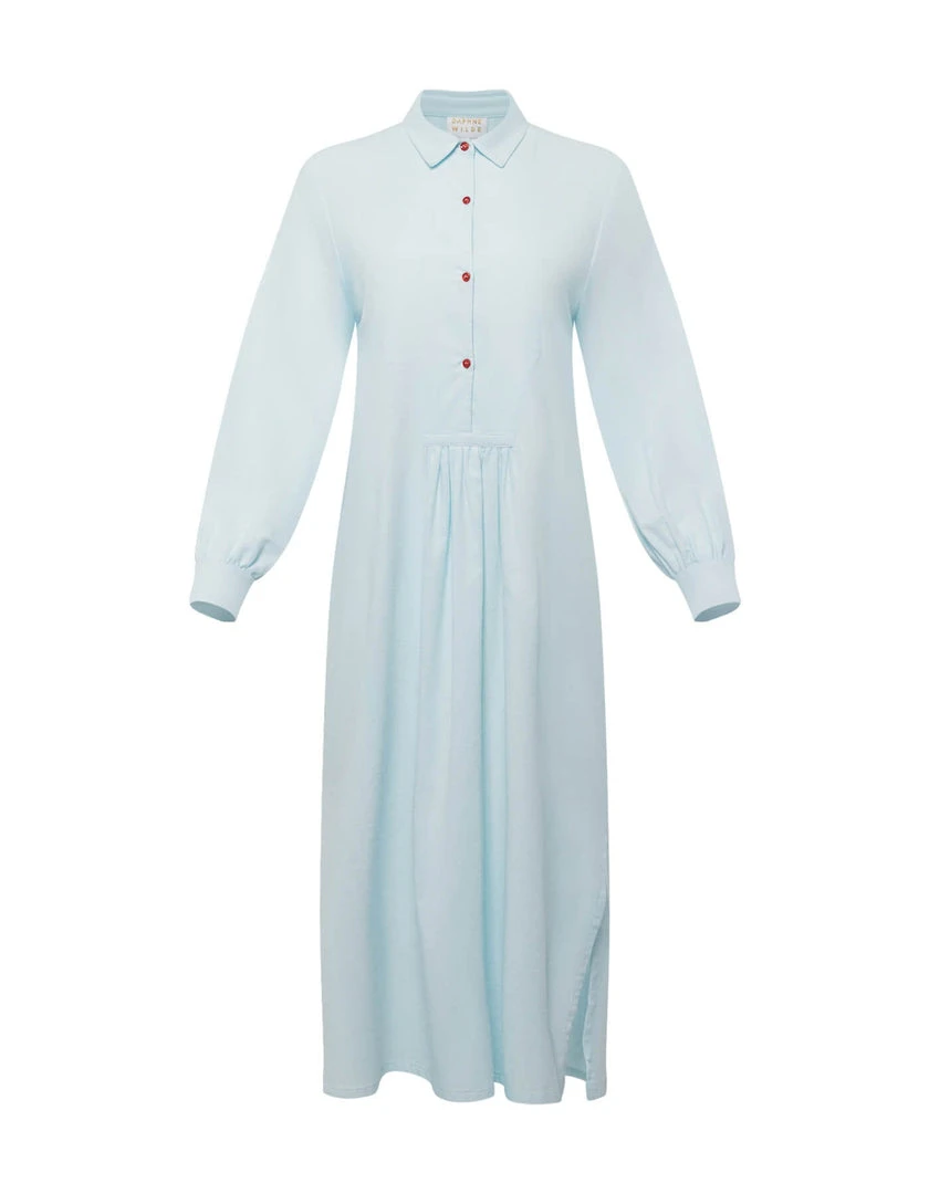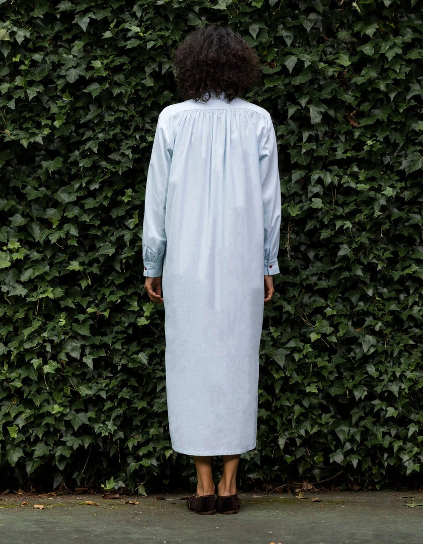 Our new nightdresses are to night as our housedresses are to day. Feel both beautiful and comfortable – no need to compromise. The collared Lulu design is inspired by an 18th century artist’s smock and has exquisite pleating and a flattering silhouette. Look chic and pulled together instantly. The gorgeous pale blue of this ultra premium Italian flannel is set off with cherry red buttons to give it a little European flair. Both chic and fun.