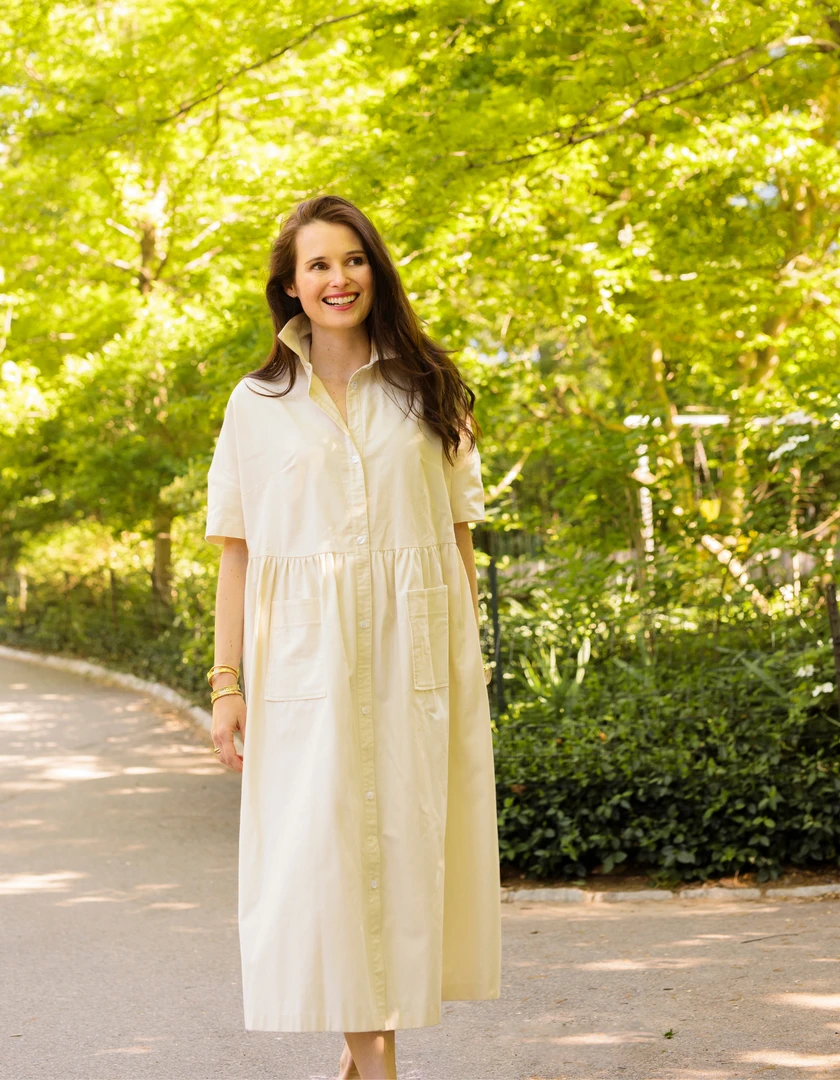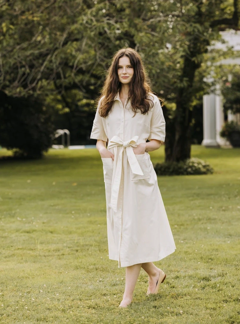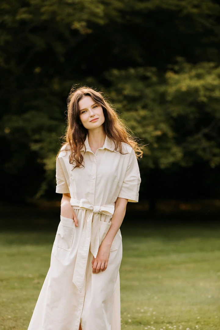 Meet a short sleeve version of our classic housedress with buttons that hit at exactly the right spot. This cream version is in a brushed cotton, making it softer and more flexible than earlier editions. Convenient pockets to hold your essentials. It can be worn belted or unbelted. Like all of our dresses, the cotton is heavyweight which makes wearing a bra optional.