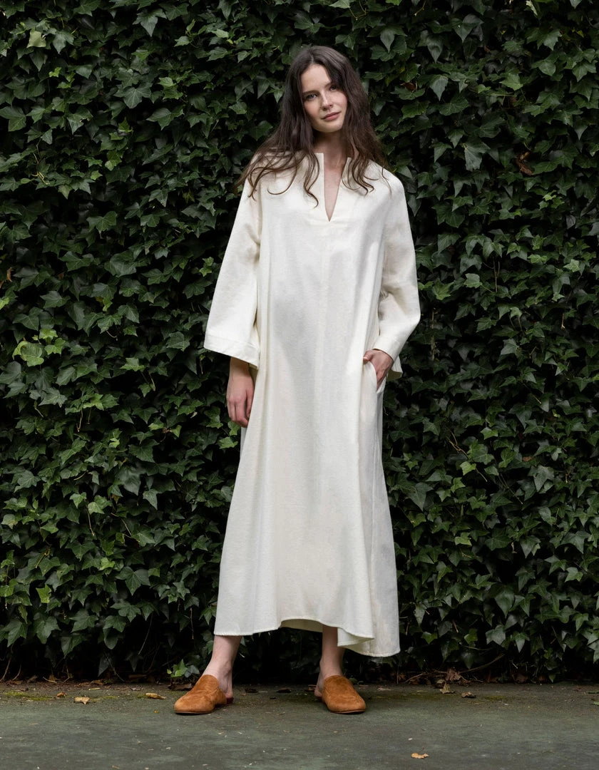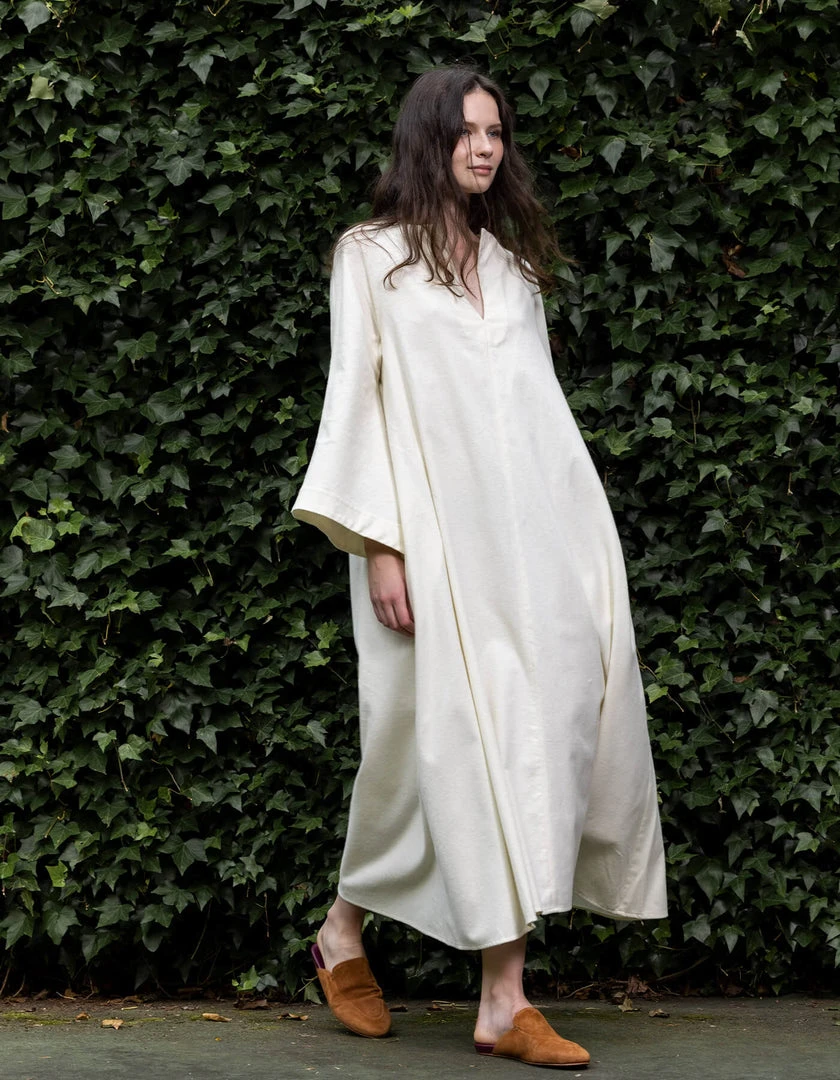 Just like during the day, it was a struggle to find something that made us feel both beautiful and comfortable in the evening. As the housedress is to day, our new nightgowns are to night. The Lizzy is exquisitely made with bell sleeves and a flowing fit. It’s incredible to sleep in but also glamorous enough for mornings with houseguests. The soft flannel fabric comes from Italy and while it may be cozy it’s certainly not your grandmother’s nightgown.