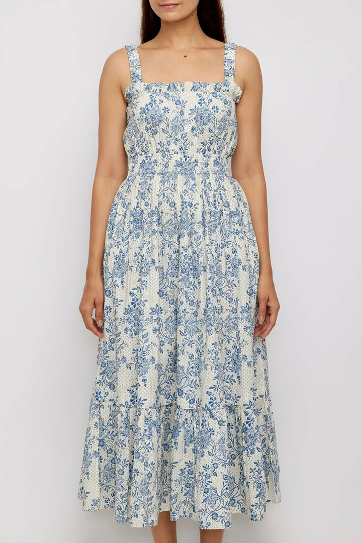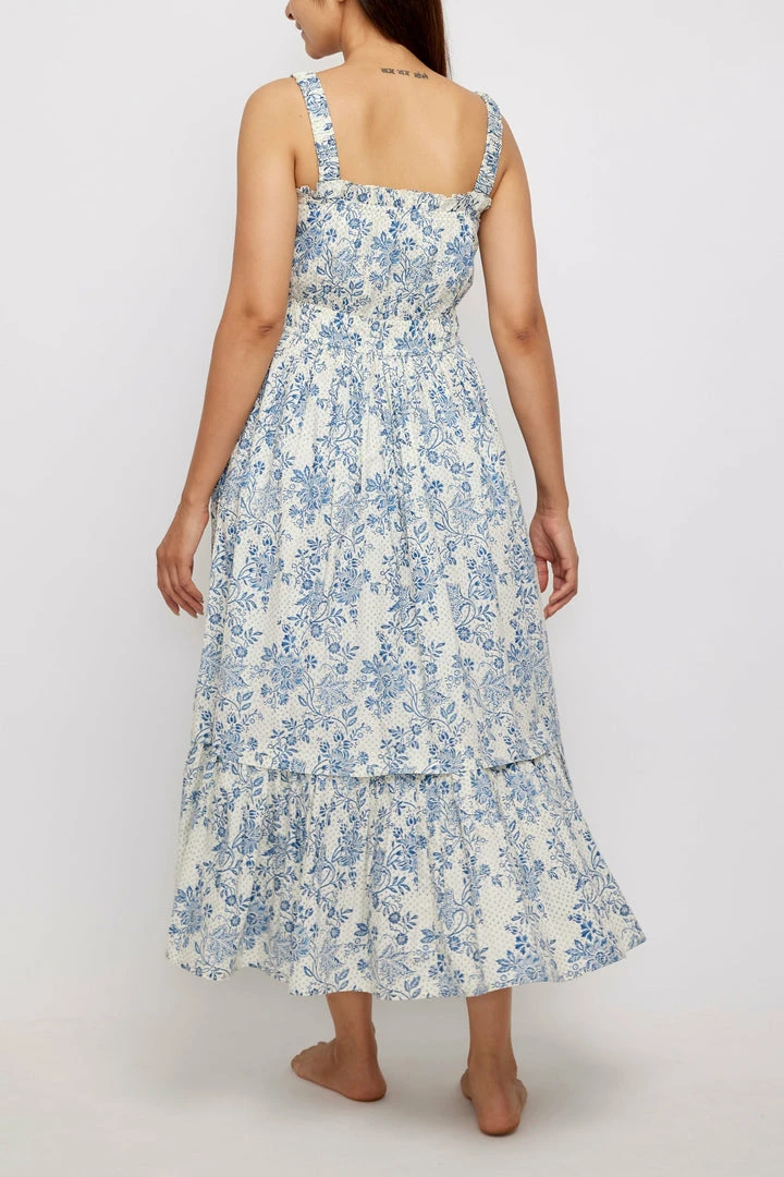 A very pretty sun-dress. The Florence is made from hand-block printed cotton poplin with gathered elasticated straps and a gathered bodice with pretty neckline frill and stretch waistband