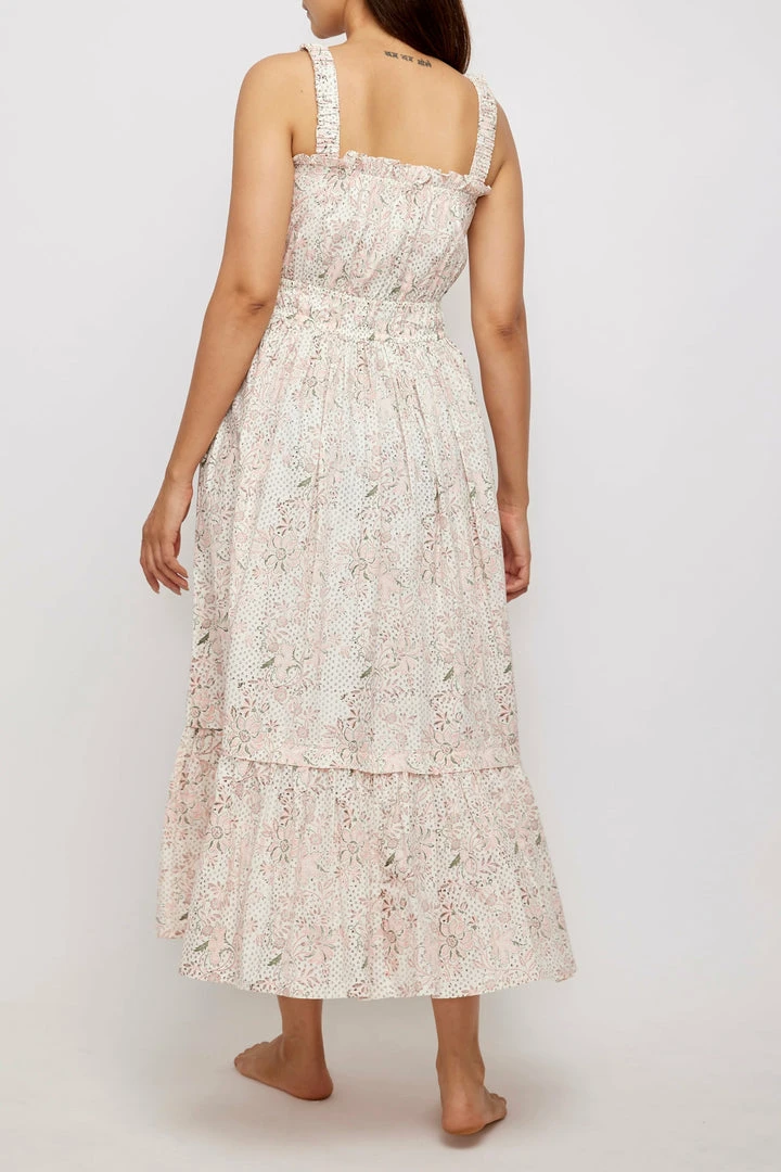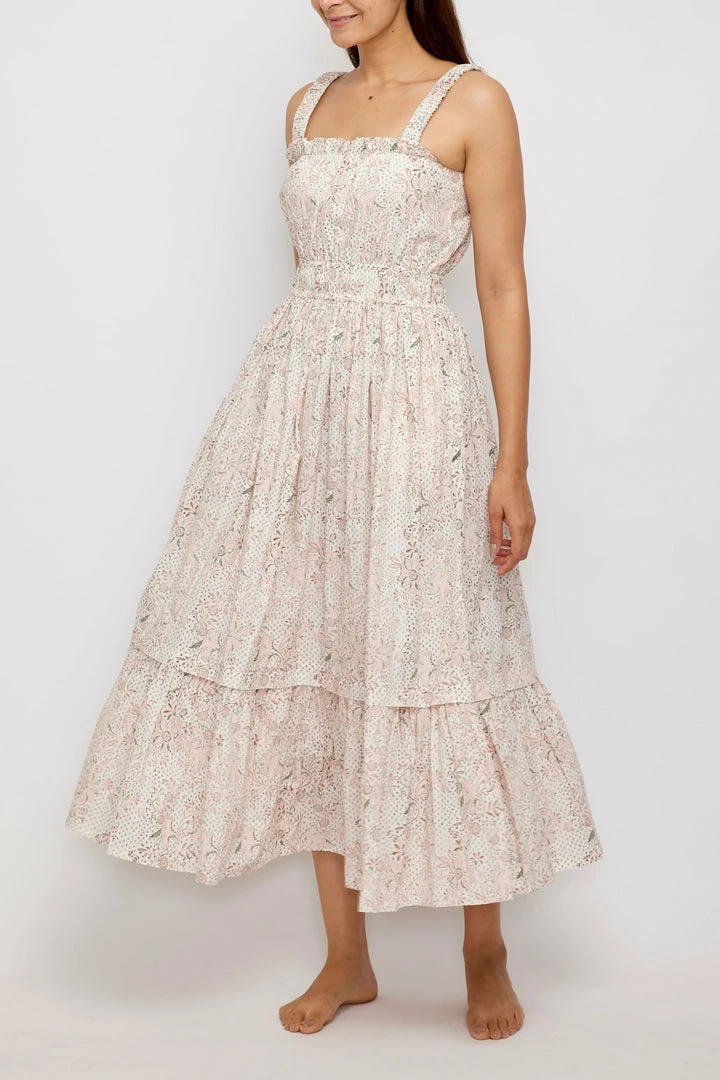 A very pretty sun-dress. The Florence is made from hand-block printed cotton poplin with gathered elasticated straps and a gathered bodice with pretty neckline frill and stretch waistband