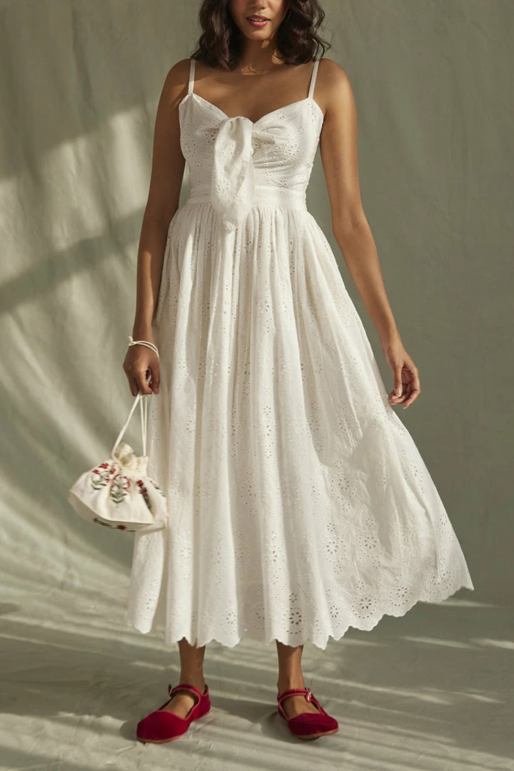 A darling sun-dress with French Riviera vibes in white cotton broderie anglaise with a pretty tie front and scalloped border detail. The straps are adjustable and the back of the bodice is smocked for a lovely fit.