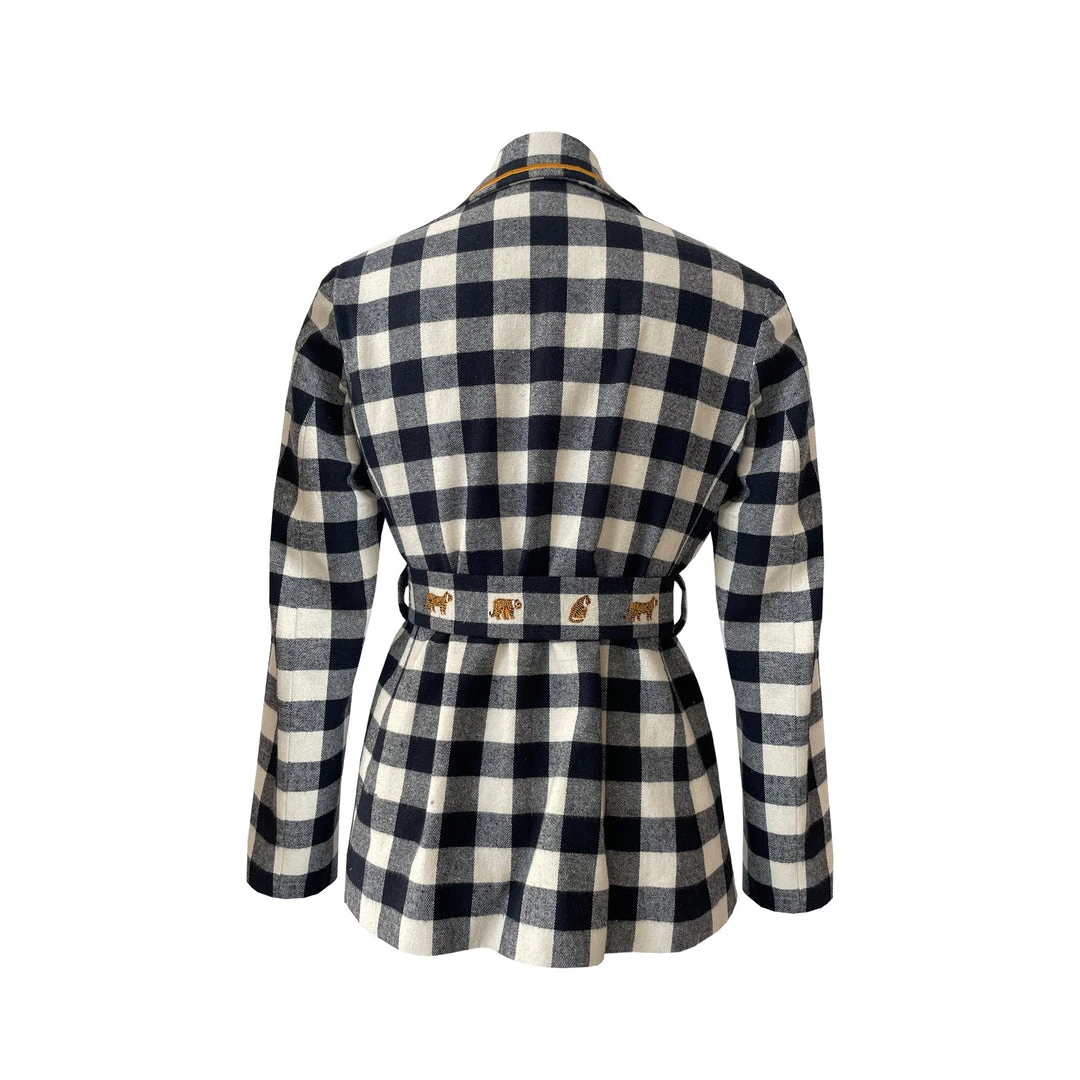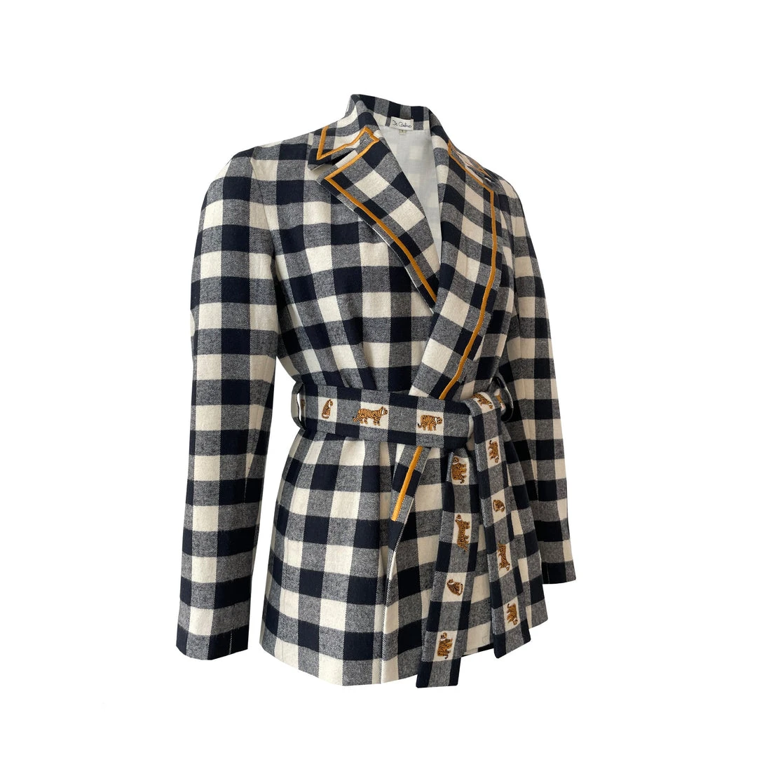 The Baagh Jacket is made of soft cotton and draws inspiration from the Ranthambore tiger reserve. It features white and navy blue check pattern fabric, with yellow embroidered tigers and yellow line on the lapel.