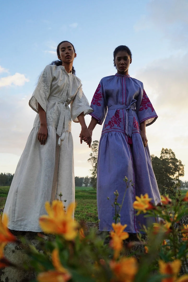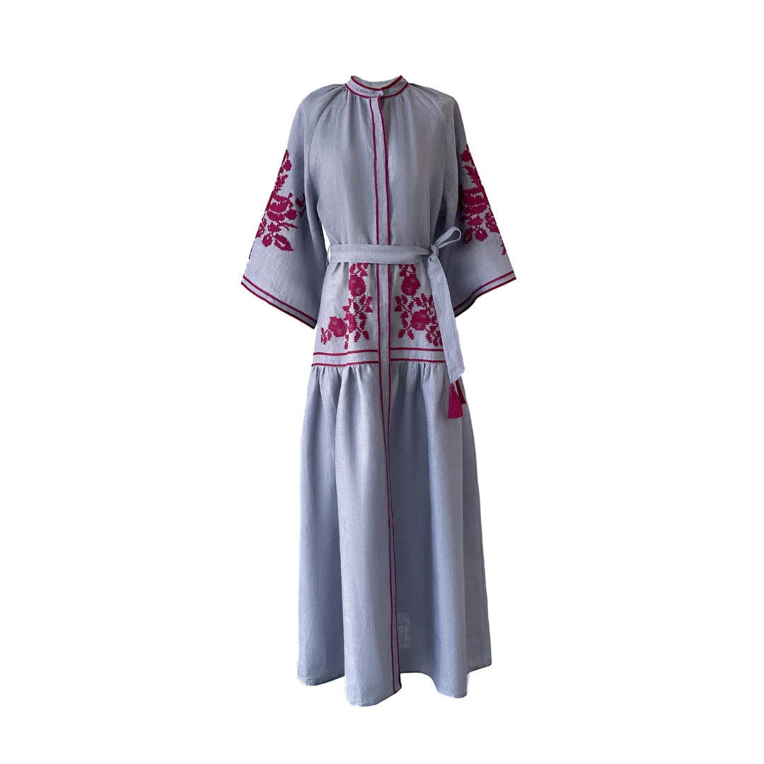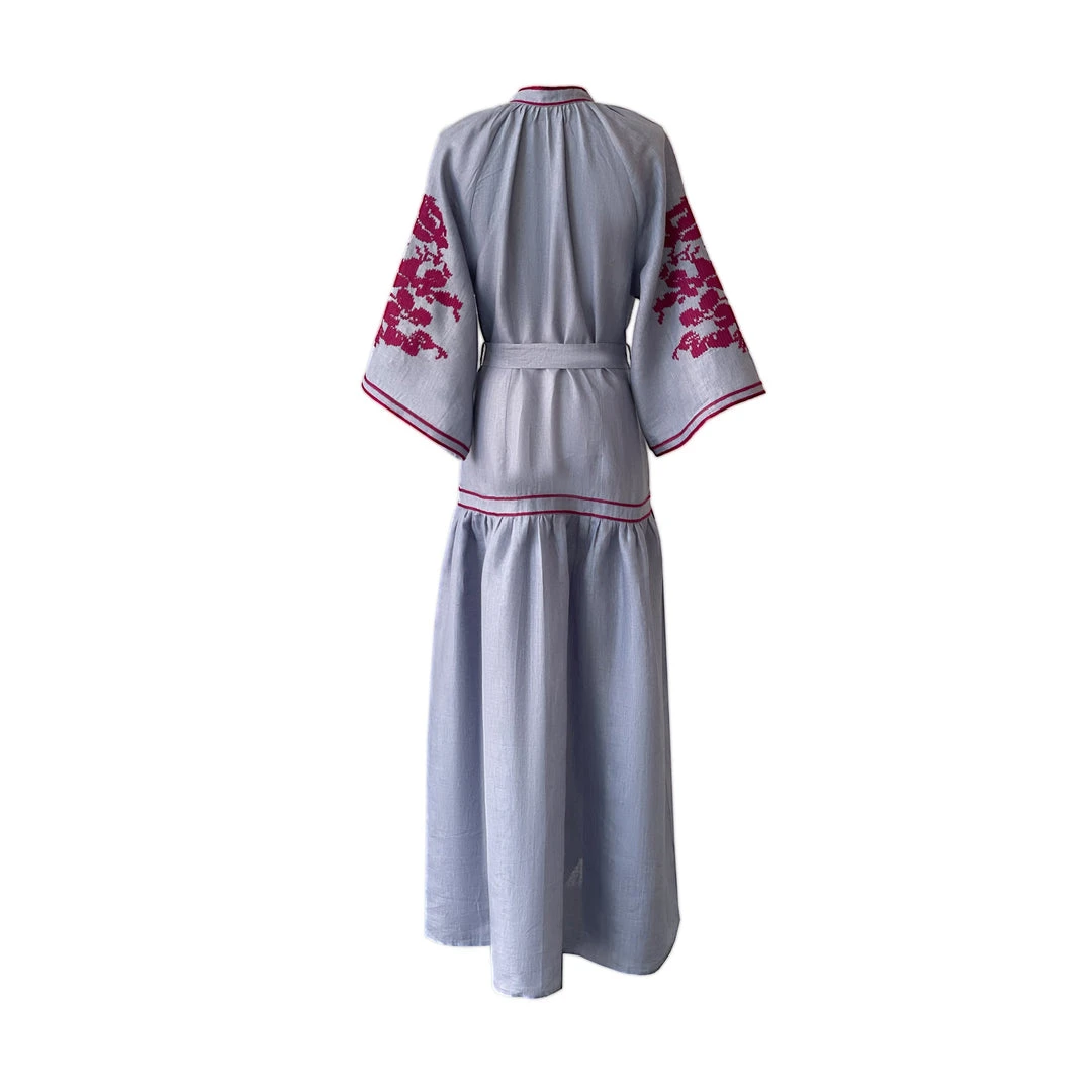The Berry dress features  front buttons, bell shaped raglan sleeves and tasseled belt.