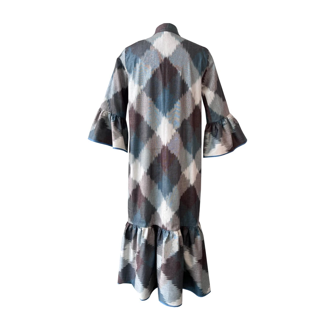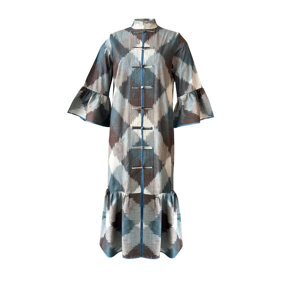 This tunic dress is inspired by traditional Chinese outfits. It is made of Uzbek silk Ikat, and it features Chinese knot buttons in the front.