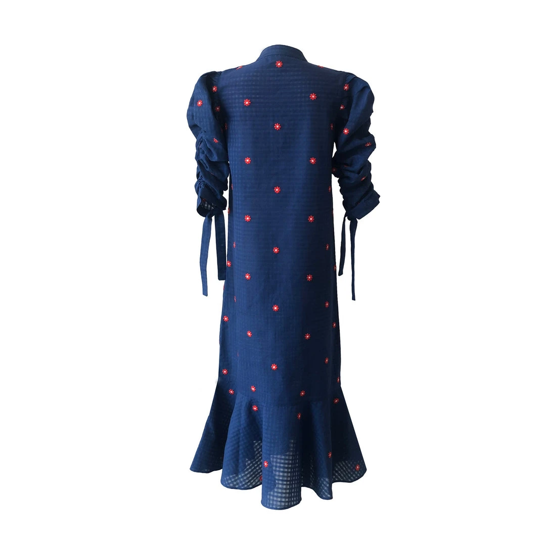 The Blue Margarita Dress is made in pure Khadi handloom cotton. It features red hand-embroidered flowers, gathered puff sleeves and wide ruffle hem.