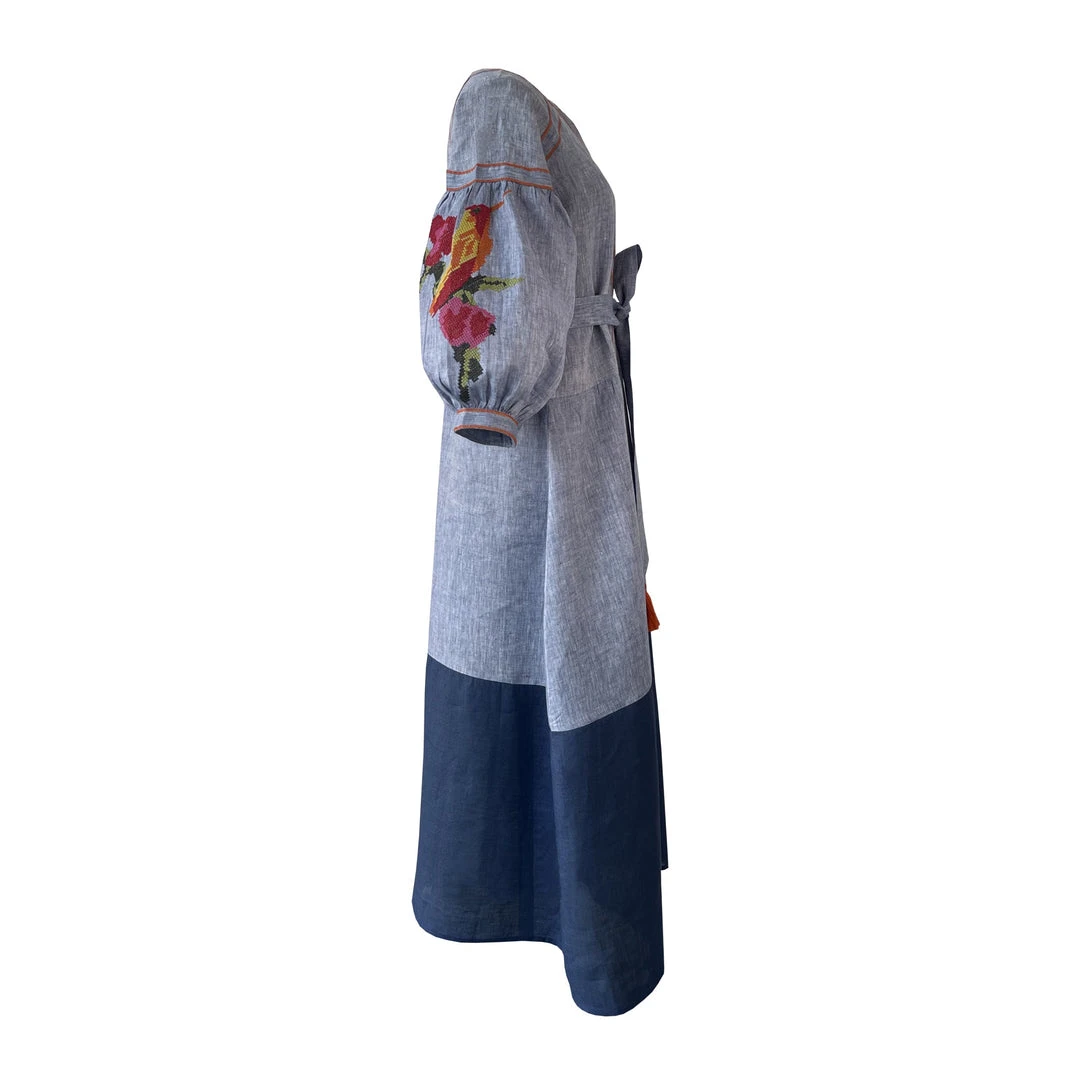 This colour-block  dress is made from handwoven linen in the south of India. It features cross stitch embroidery and a belt.